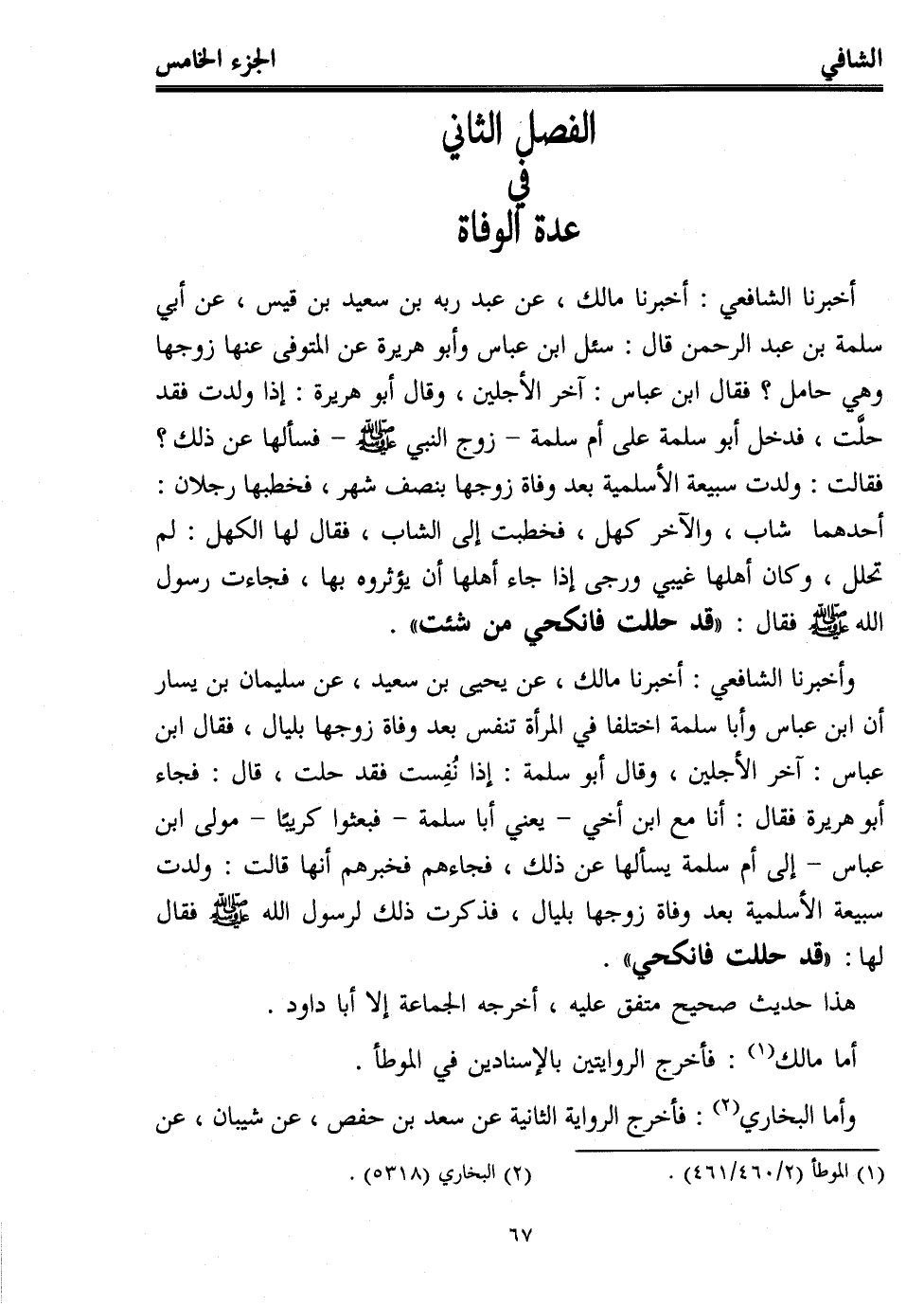 وأخبرنا الشافعي: أخبرنا مالك، عن يحيى بن سعيد، عن سليمان بن يسار أن ابن عباس وأبا سلمة اختلفا في المرأة تنفس بعد وفاة زوجها بليال، فقال ابن عباس: آخر الأجلين، وقال أبو سلمة: إذا نُفِست فقد حلت، قال: فجاء أبو هريرة فقال: أنا مع ابن أخي -يعني أبا سلمة- فبعثوا كريبًا -مولى ابن عباس- إلى أم سلمة يسألها عن ذلك، فجاءهم فخبرهم أنها قالت: ولدت سبيعة الأسلمية بعد وفاة زوجها بليال، فذكرت ذلك لرسول الله - صلى الله عليه وسلم - فقال لها: "قد حللت فانكحي".