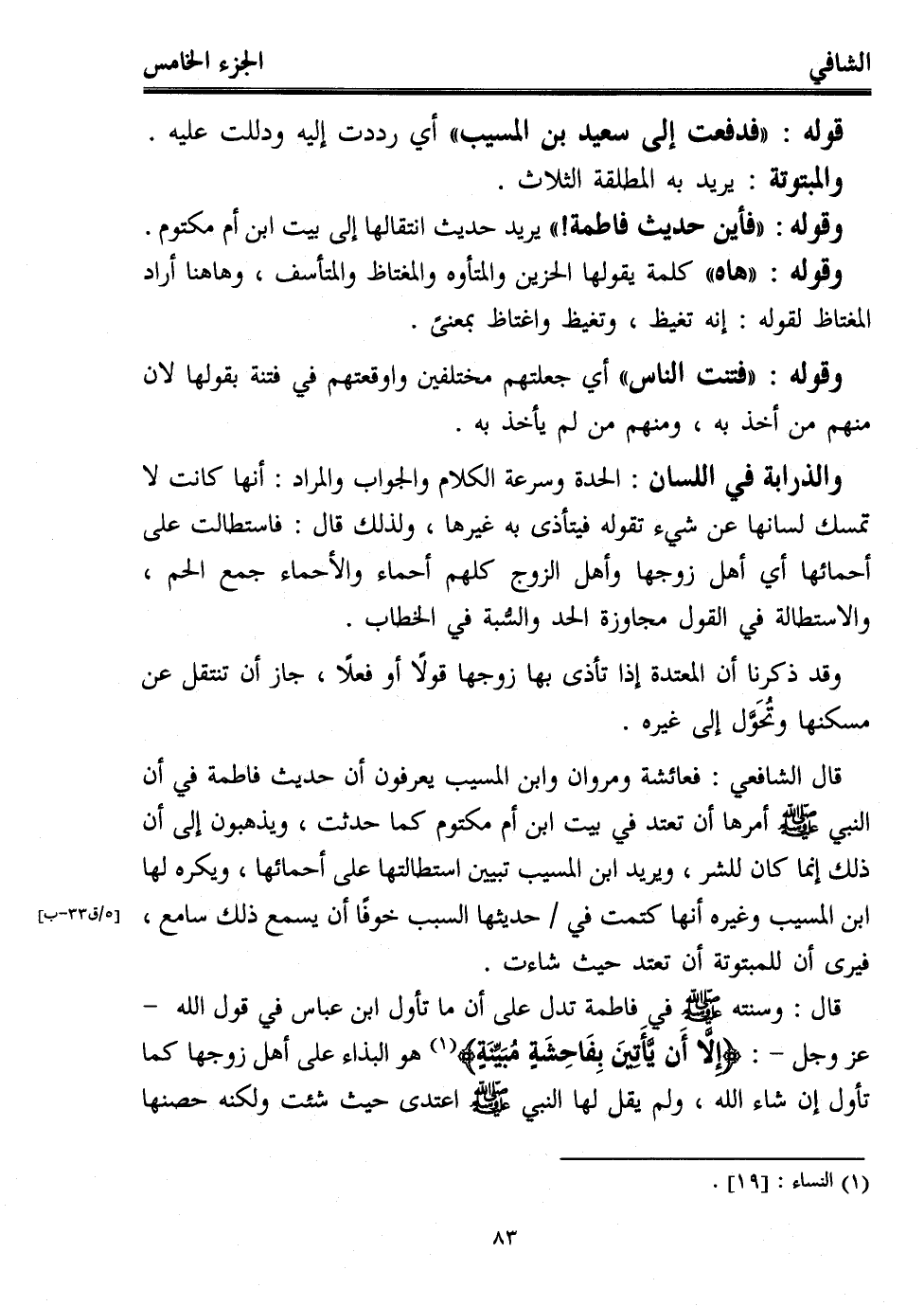 قال: وسنته - صلى الله عليه وسلم - في فاطمة تدل على أن ما تأول ابن عباس في قول الله -عز وجل-: {إِلَّا أَنْ يَأْتِينَ بِفَاحِشَةٍ مُبَيِّنَةٍ} (¬1) هو البذاء على أهل زوجها كما تأول إن شاء الله، ولم يقل لها النبي - صلى الله عليه وسلم - اعتدى حيث شئت ولكنه حصنها