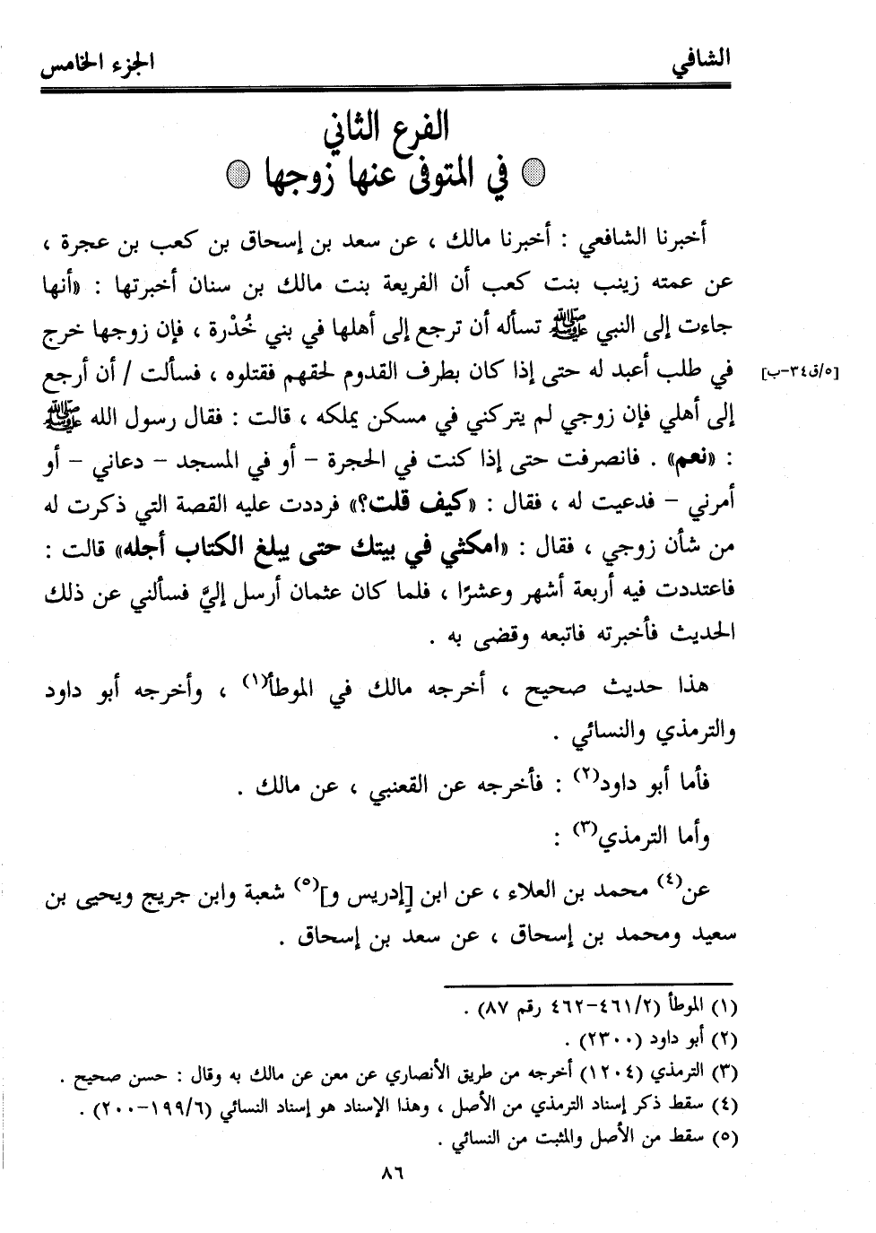 أخبرنا الشافعي: أخبرنا مالك، عن سعد بن إسحاق بن كعب بن عجرة، عن عمته زينب بنت كعب أن الفريعة بنت مالك بن سنان أخبرتها: "أنها جاءت إلى النبي - صلى الله عليه وسلم - تسأله أن ترجع إلى أهلها في بني خُدْرة، فإن زوجها خرج في طلب أعبد له حتى إذا كان بطرف القدوم لحقهم فقتلوه، فسألت أن أرجع إلى أهلي فإن زوجي لم يتركني في مسكن يملكه، قالت: فقال رسول الله - صلى الله عليه وسلم -: "نعم". فانصرفت حتى إذا كنت في الحجرة -أو في المسجد- دعاني -أو أمرني- فدعيت له، فقال: "كيف قلت؟ " فرددت عليه القصة التي ذكرت له من شأن زوجي، فقال: "امكثي في بيتك حتى يبلغ الكتاب أجله" قالت: فاعتددت فيه أربعة أشهر وعشرًا، فلما كان عثمان أرسل إليَّ فسألني عن ذلك الحديث فأخبرته فأتبعه وقضى به.
