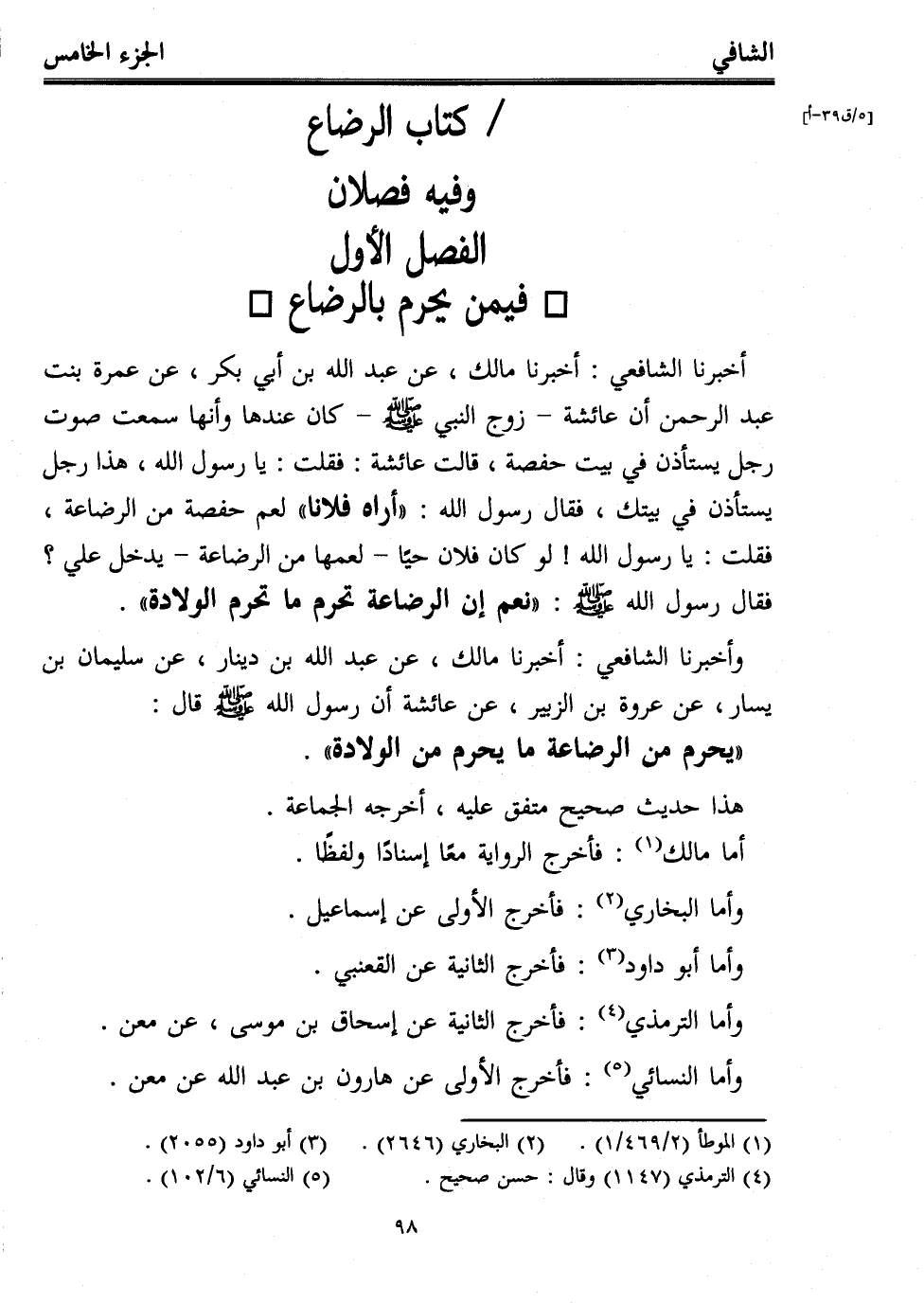 أخبرنا الشافعي: أخبرنا مالك، عن عبد الله بن أبي بكر، عن عمرة بنت عبد الرحمن أن عائشة -زوج النبي - صلى الله عليه وسلم- كان عندها وأنها سمعت صوت رجل يستأذن في بيت حفصة، قالت عائشة: فقلت: يا رسول الله، هذا رجل يستأذن في بيتك، فقال رسول الله: "أراه فلانا" لعم حفصة من الرضاعة، فقلت: يا رسول الله! لو كان فلان حيًا -لعمها من الرضاعة- يدخل علي؟ فقال رسول الله - صلى الله عليه وسلم -: "نعم إن الرضاعة تحرم ما تحرم الولادة".