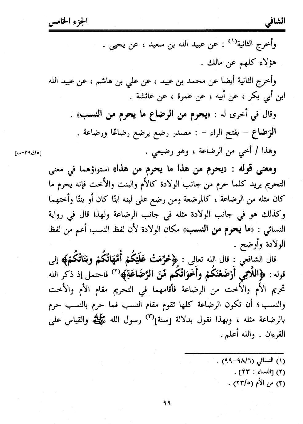 قال الشافعي: قال الله تعالى: {حُرِّمَتْ عَلَيْكُمْ أُمَّهَاتُكُمْ وَبَنَاتُكُمْ} إلى قوله: {اللَّاتِي أَرْضَعْنَكُمْ وَأَخَوَاتُكُمْ مِنَ الرَّضَاعَةِ} (¬2) فاحتمل إذ ذكر الله تحريم الأم والأخت من الرضاعة فأقامهما في التحريم مقام الأم والأخت والنسب؛ أن تكون الرضاعة كلها تقوم مقام النسب فما حرم بالنسب حرم بالرضاعة مثله، وبهذا نقول بدلالة [سنة] (¬3) رسول الله - صلى الله عليه وسلم - والقياس على القرءان. والله أعلم.