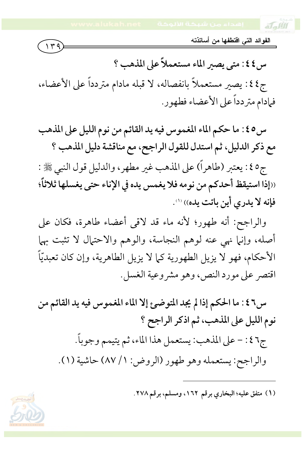 س45: ما حكم الماء المغموس فيه يد القائم من نوم الليل على المذهب مع ذكر الدليل، ثم استدل للقول الراجح، مع مناقشة دليل المذهب؟