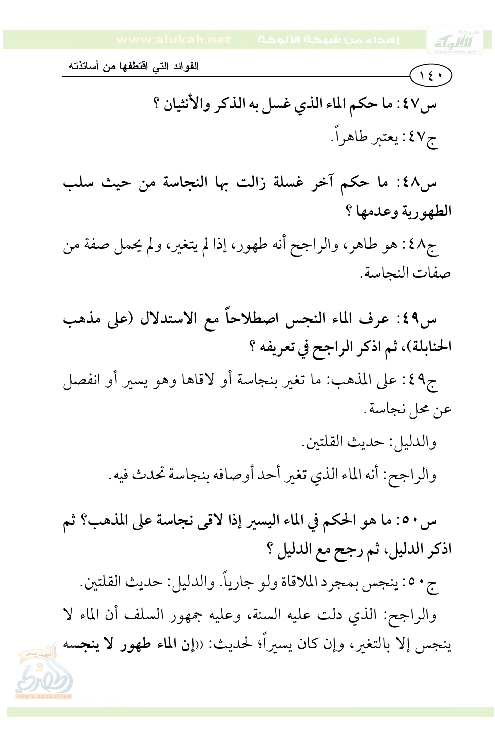 س50: ما هو الحكم في الماء اليسير إذا لاقى نجاسة على المذهب؟ ثم اذكر الدليل، ثم رجح مع الدليل؟