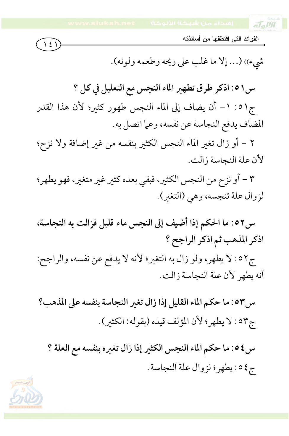 س54: ما حكم الماء النجس الكثير إذا زال تغيره بنفسه مع العلة؟