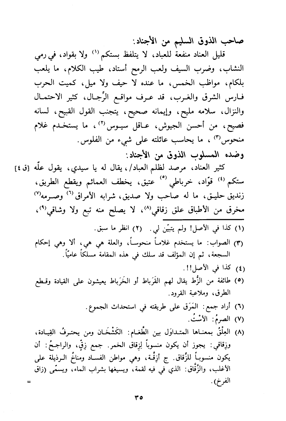 قليل العناد منفعة للعباد، لا يتلفظ بستكم ولا بقواد، في رمي النشاب، وضرب السيف ولعب الرمح أستاذ، طيب الكلام، ما يلعب بلكام، مواظب الخمس، ما عنده لا حيف ولا ميل، كميت الحرب فارس الشرق والغرب، قد عرف مواقع الرجال، كثير الاحتمال والنزال سلامه مليح، وإيمانه صحيح، يتجنب القول القبيح، لسانه فصيح، من أحسن الجيوش، عاقل سيوس، ما يستخدم غلام منحوس، ما يحاسب عائلته على شيء من الفلوس.