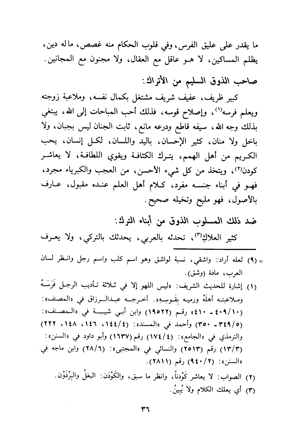كبير ظريف، عفيف شريف مشتغل بكمال نفسه، وملاعبة زوجته ويعلم فرسه، وإصلاح قوسه، فذلك أحب المباحات إلى الله، يبتغي بذلك وجه الله، سيفه قاطع ودرعه مانع، ثابت الجنان ليس بجبان، ولا باخل ولا منان، كثير الإحسان، باليد واللسان، لكل إنسان، يحب الكريم من أهل الهمم، يترك الكثافة ويقوي اللطافة، لا يعاشر كودن، ويتخذ من كل شيء الأحسن، من العجب والكبرياء مجرد، فهو في أبناء جنسه مفرد، كلام أهل العلم عنده مقبول، عارف بالأصول، فهو مليح وتخيله صحيح.