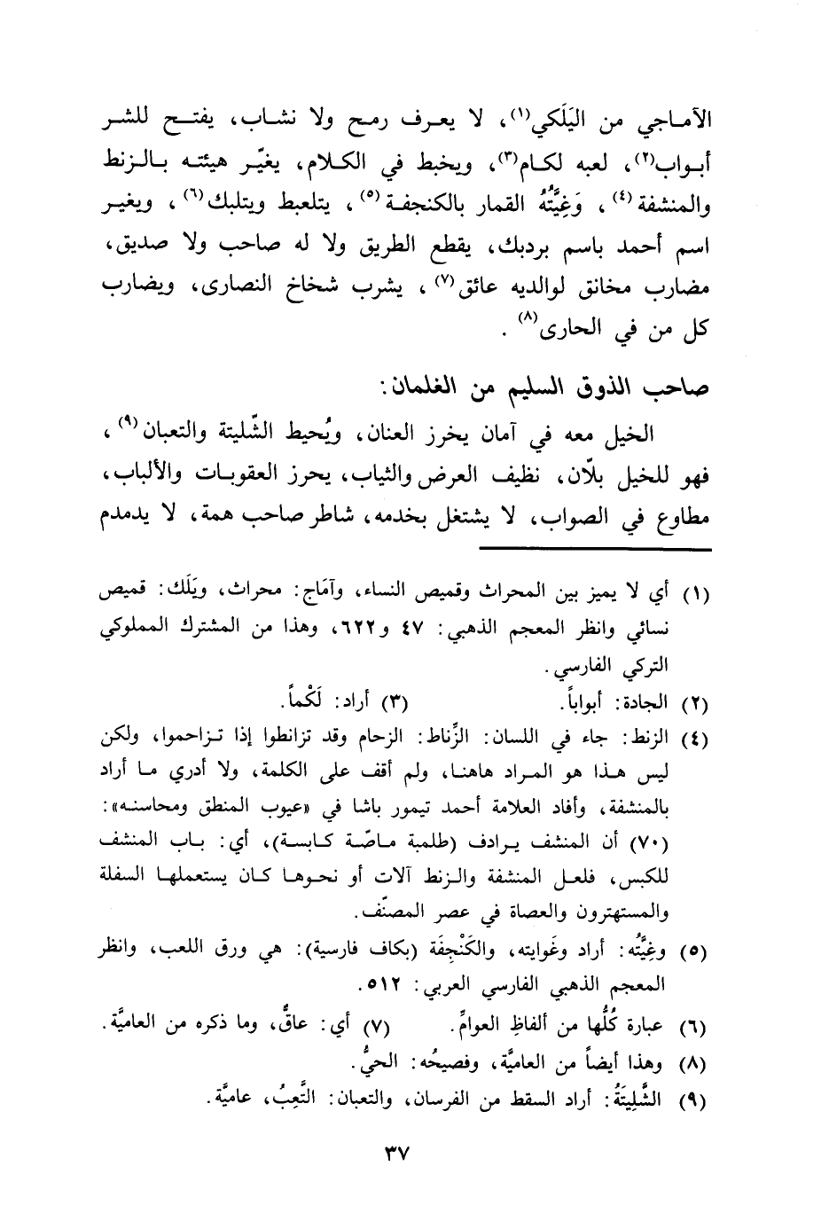 الخيل معه في آمان يخرز العنان، ويحيط الشليته والتعبان، فهو للخيل بلان، نظيف العرض والثياب، يحرز العقوبات والألباب، مطلوع في الصواب، لا يشتغل بخدمه، شاطر صاحب همة، لا يدمدم