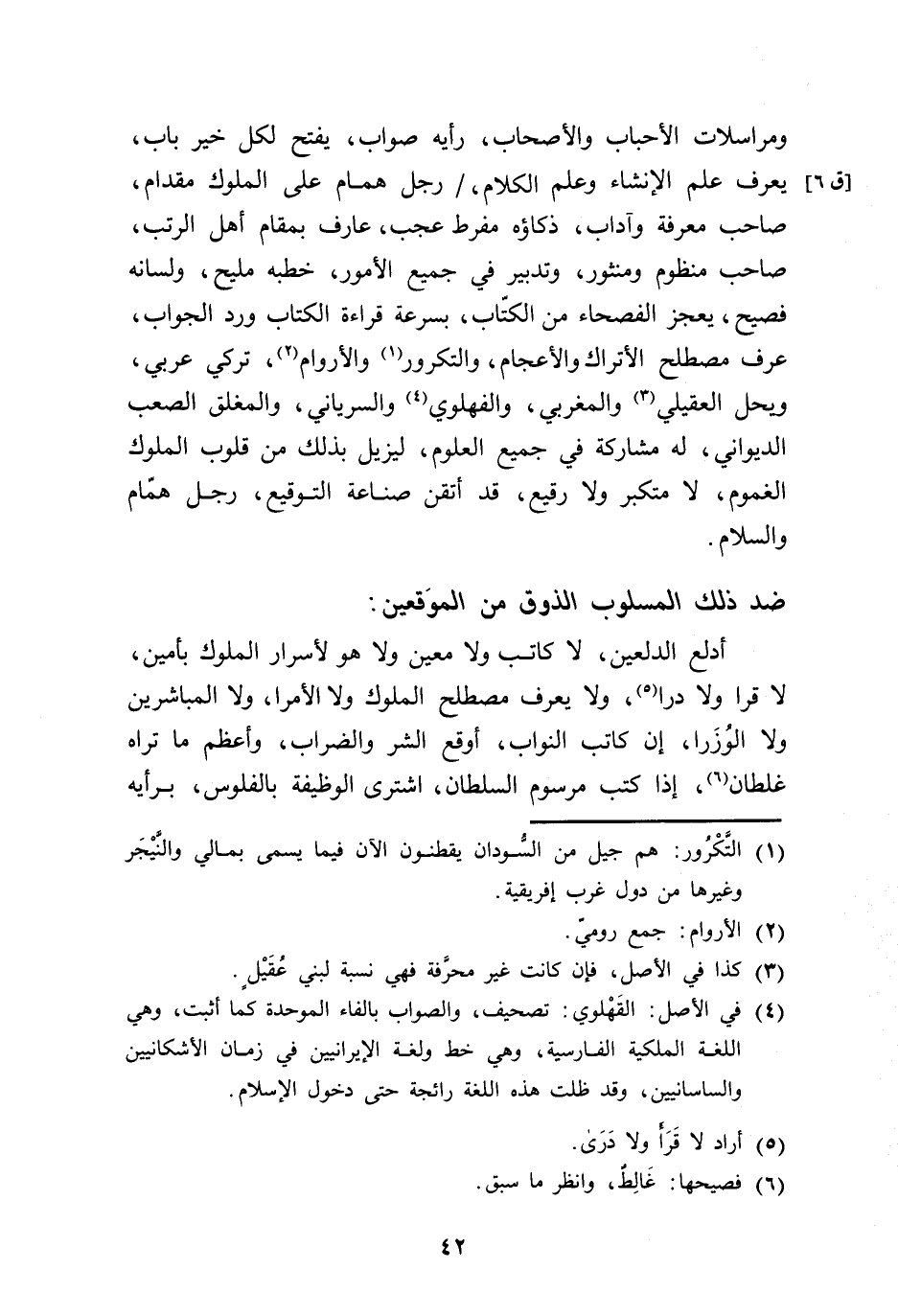 ومراسلات الأحباب والأصحاب، رأيه صواب، يفتح لكل خير باب، يعرف علم الإنشاء علم الكلام، رجل همام على الملوك مقدام، صاحب معرفة وآداب، ذكاؤه مفرط عجب، عارف بمقام أهل الرتب، صاحب منظوم ومنثور، وتدبير في جميع الأمور، خطبه مليح، ولسانه فصيح، يعجز الفصحاء من الكتاب، بسرعة قراءة الكتاب ورد الجواب، عرف مصطلح الأتراك والأعجام، والتكرور والأروام، تركي عربي، ويحل العقيلي والمغربي، والفهلوي والسرياني، والمغلق الصعب الديواني، له مشاركة في جميع العلوم، ليزيل بذلك من قلوب الملوك الغموم، لا متكبر ولا رقيع، قد اتقن صناعة التوقيع، رجل همام والسلام.