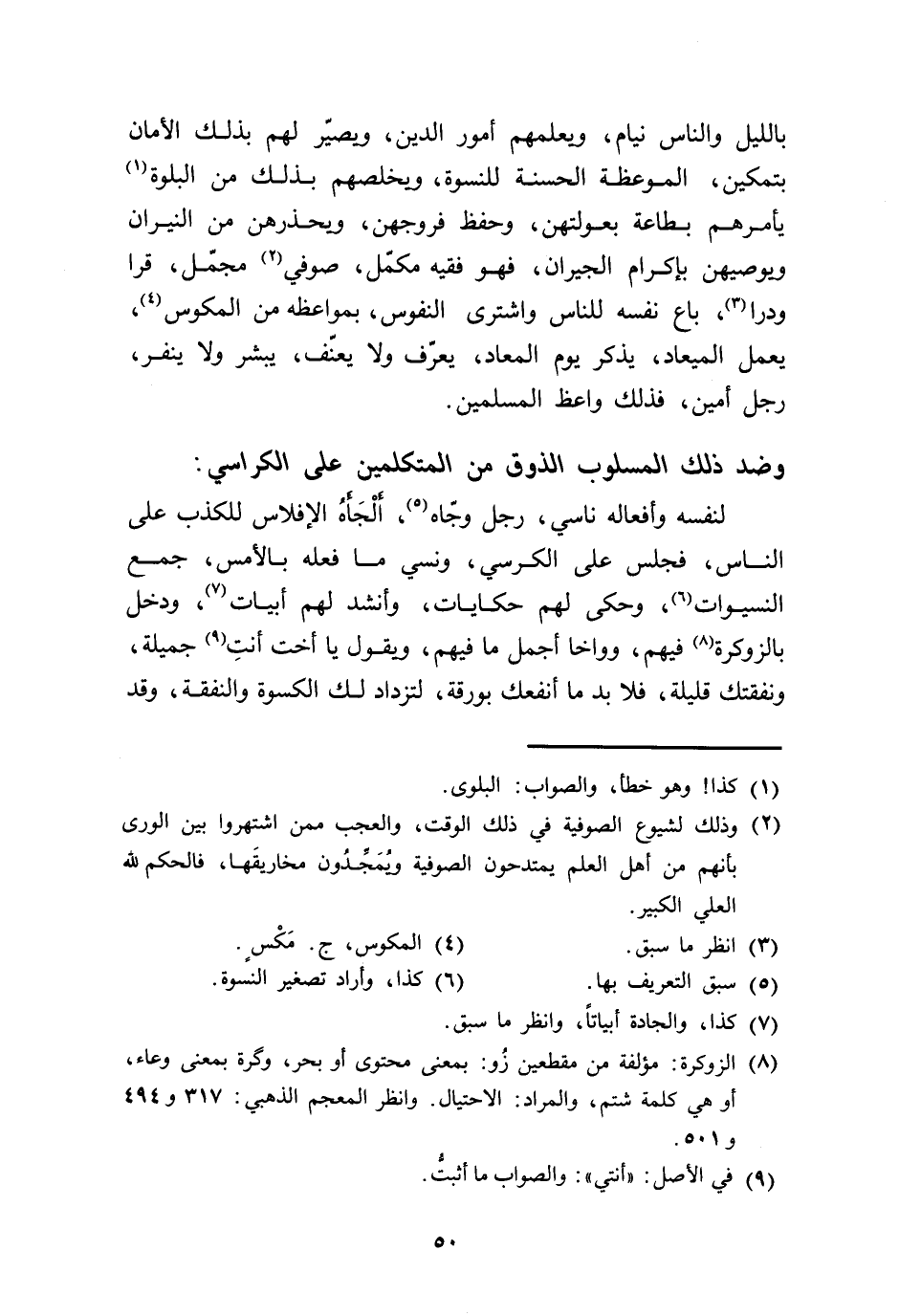 بالليل والناس نيام، ويعلمهم أمور الدين، ويصير لهم بذلك الأمان بتمين، الموعظة الحسنة للنسوة، ويخلصهم بذلك من البلوة يأمرهم بطاعة بعولتهن، وحفظ فروجهن من النيران ويوصيهن بإكرام الجيران، فهو فقيه مكمل، صوفي مجمل، قرا ودرع، باع نفسه للناس واشترى النفوس، بمواعظه من المكوس، يعمل الميعاد، يذكر يوم المعاد، يعرف ولا يعنف، يبشر ولا ينفر، رجل أمين، فذلك واعظ المسلمين.