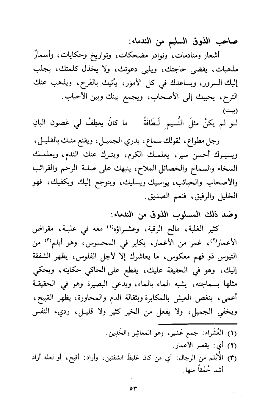 أشعار ومنادمات، ونوادر مضحكات، وتواريخ وحكايات، وأسمار مذهبات، يقضي حاجتك، ويلبي دعوتك، ولا يخذل كلمتك، يجلب إليك السرور، ويساعدك في كل الأمور، يأتيك بالفرح، ويذهب عنك الترح، يحببك إلى الأصحاب، ويجمع بينك وبين الأحباب.
