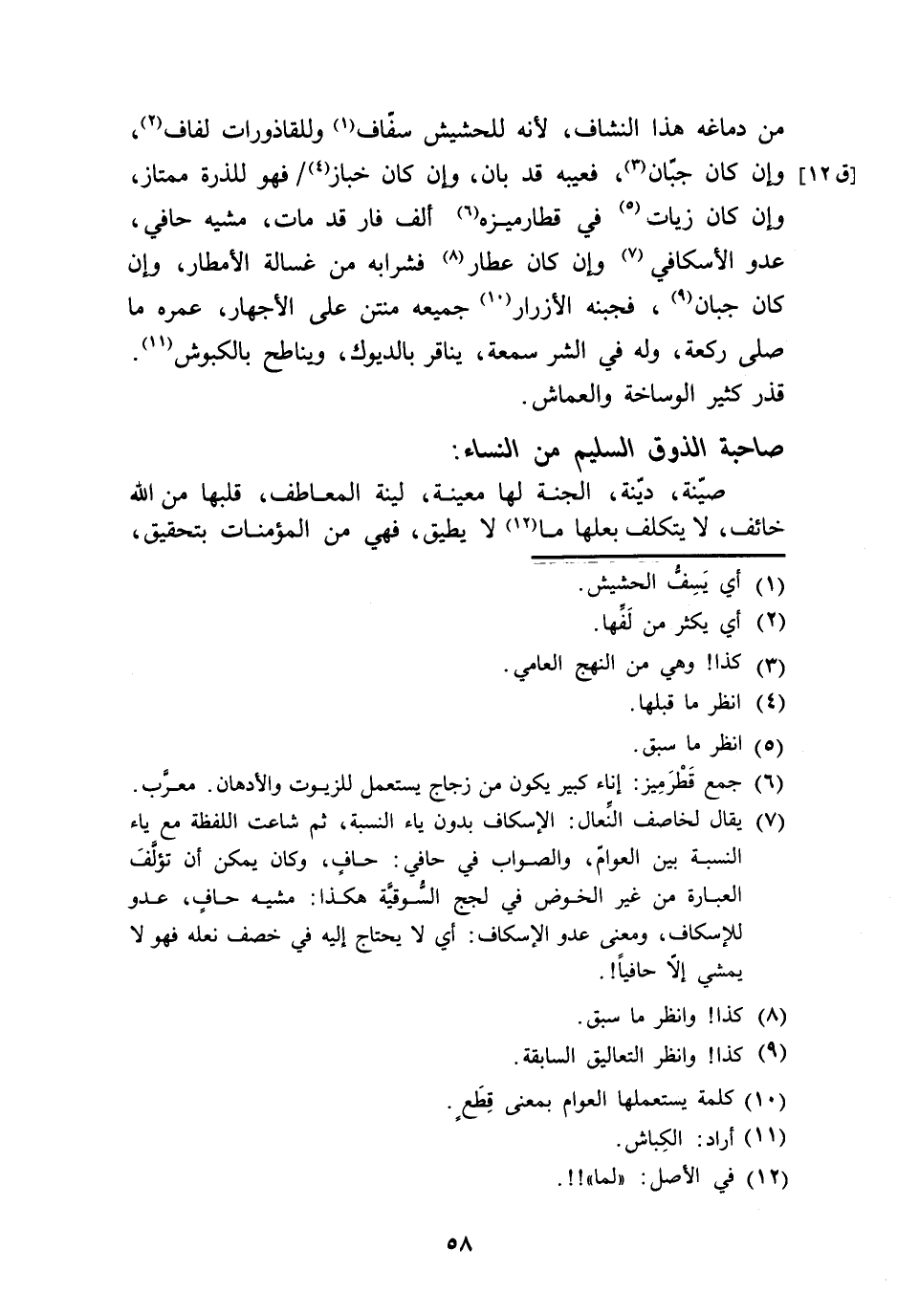 من دماغه هذا النشاف، لأنه للحشيش سفاف وللقاذورات لفاف، وإن كان جبان، فعيبه قد بان، وإن كان خباز فهو للذرة ممتاز، وإن كان زيات في قطار ميزه ألف فار قد مات، مشيه حافي، عدو الأسكافي وإن كان عطار فشرابه من غسالة الأمطار، وإن كان جبان، فجبنه الأزرار جميعه منتن على الأجهار، عمره ما صلى ركعة، وله في الشر سمعة، يناقر بالديوك، ويناطح بالكبوش. قذر كثير الوساخة والعماش.