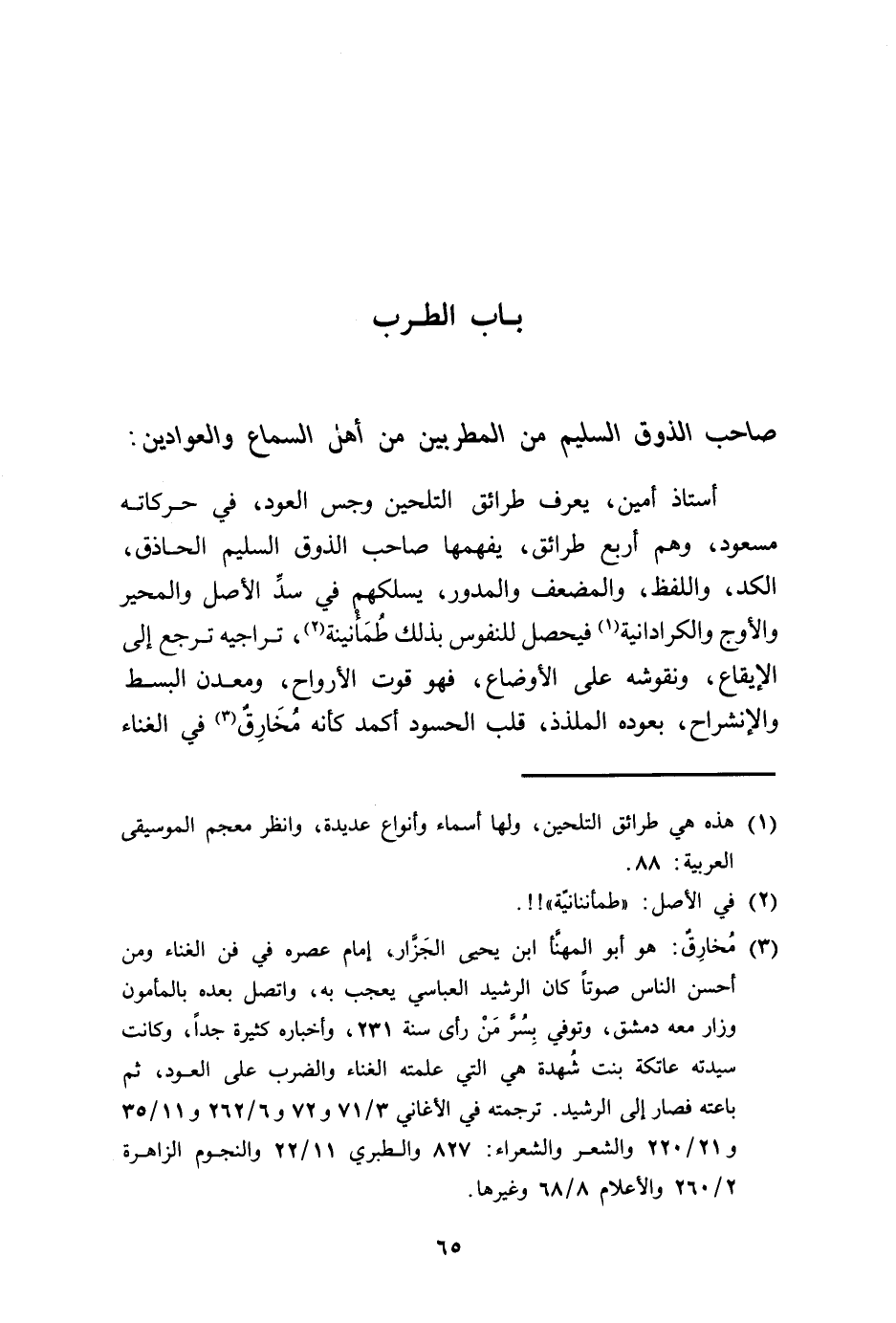 صاحب الذوق السليم من المطربين من أهل السماع والعوادين: أستاذ أمين، يعرف طرائق التلحين وجس العود، في حركاته مسعود، وهم أربع طرائق، يفهمها صاحب الذوق السليم الحاذق، الكد، واللفظ، والمضعف والمدور، يسلكهم في سد الأصل والمحير والأوج والكرادانية فيحصل للنفوس بذلك طمأنينة، تراجيه ترجع إلى الإيقاع، ونقوشه على الأوضاع، فهو قوت الأرواح، ومعدن البسط والإنشراح، بعوده الملذذ، قلب الحسود أكمد كأنه مخارق في الغناء