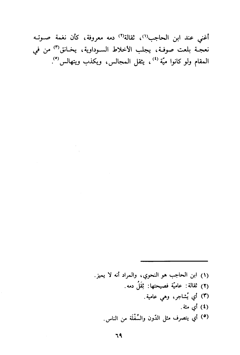 أغني عند ابن الحاجب، ثقالة دمه معروفة، كأنه نغمة صوته نعجة بلعت صوفة، يجلب الأخلاط السوداوية، يخانق من في المقام ولو كانوا مية، يثقل المجالس، ويكذب ويتهالس.
