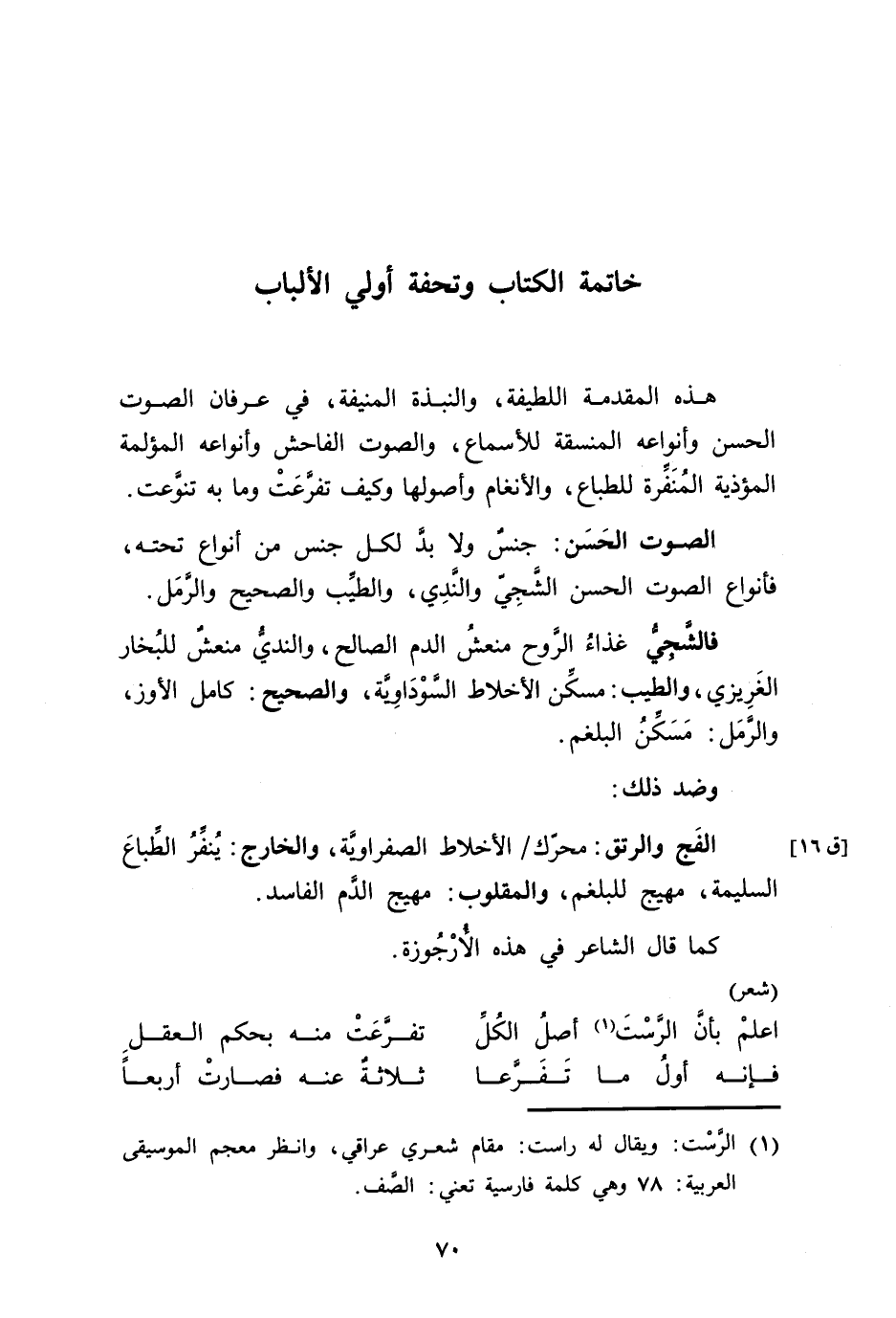 هذه المقدمة اللطيفة، والنبذة المنيفة، في عرفان الصوت الحسن وأنواعه المنسقة للأسماع، والصوت وأنواعه المؤلمة المؤذية المنفرة للطباع، والأنغام وأصولها وكيف تفرعت وما به تنوعت.