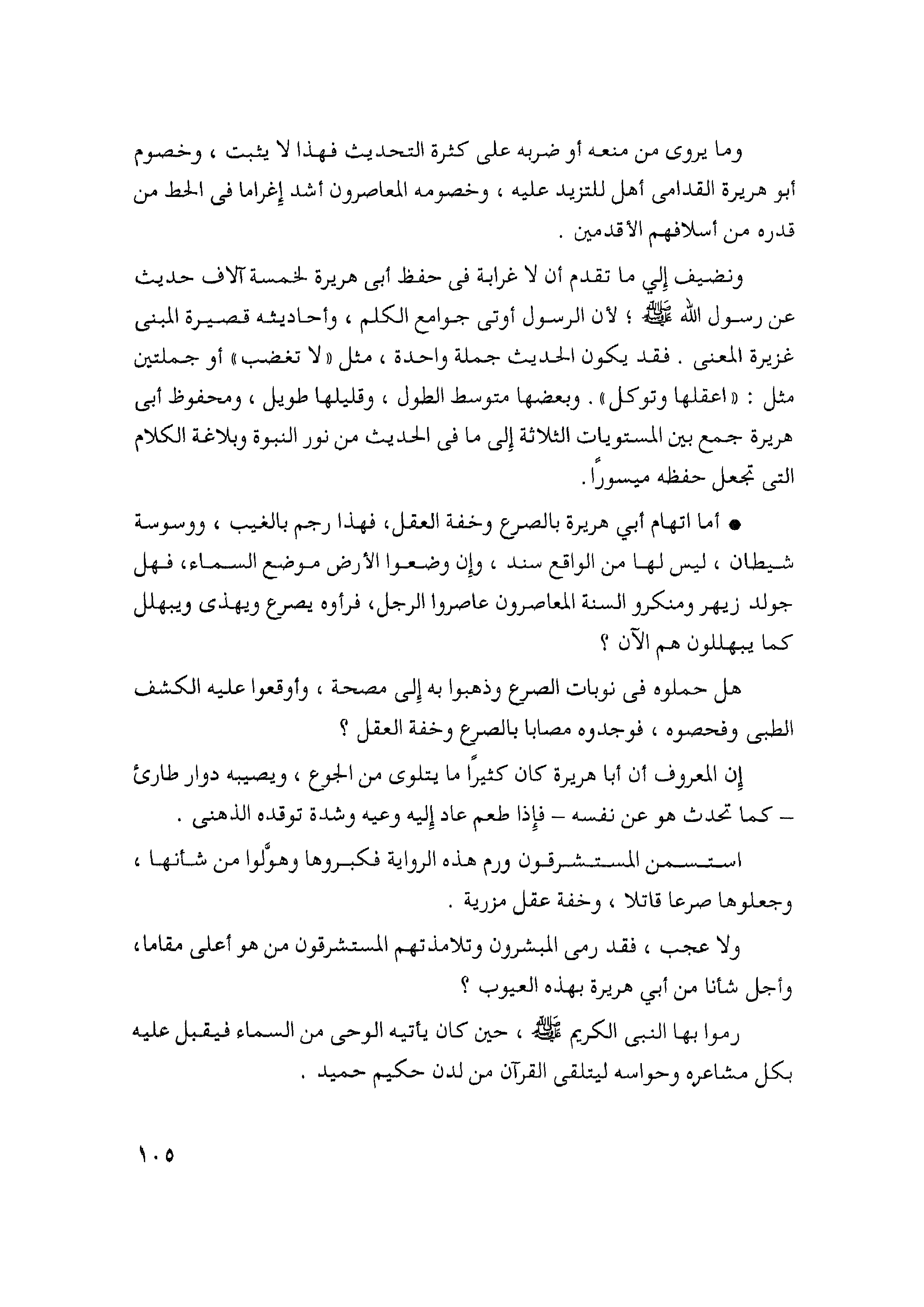 * أما اتهام أبي هريرة بالصرع وخفة العقل، فهذا رجم بالغيب، ووسوسة شيطان، ليس لها من الواقع سند، وإن وضعوا الأرض موضع السماء، فهل جولد زيهر ومنكرو المعاصرون عاصروا الرجل، فرأوه يصرع ويهذى ويبهلل كما يبهللون هم الآن؟