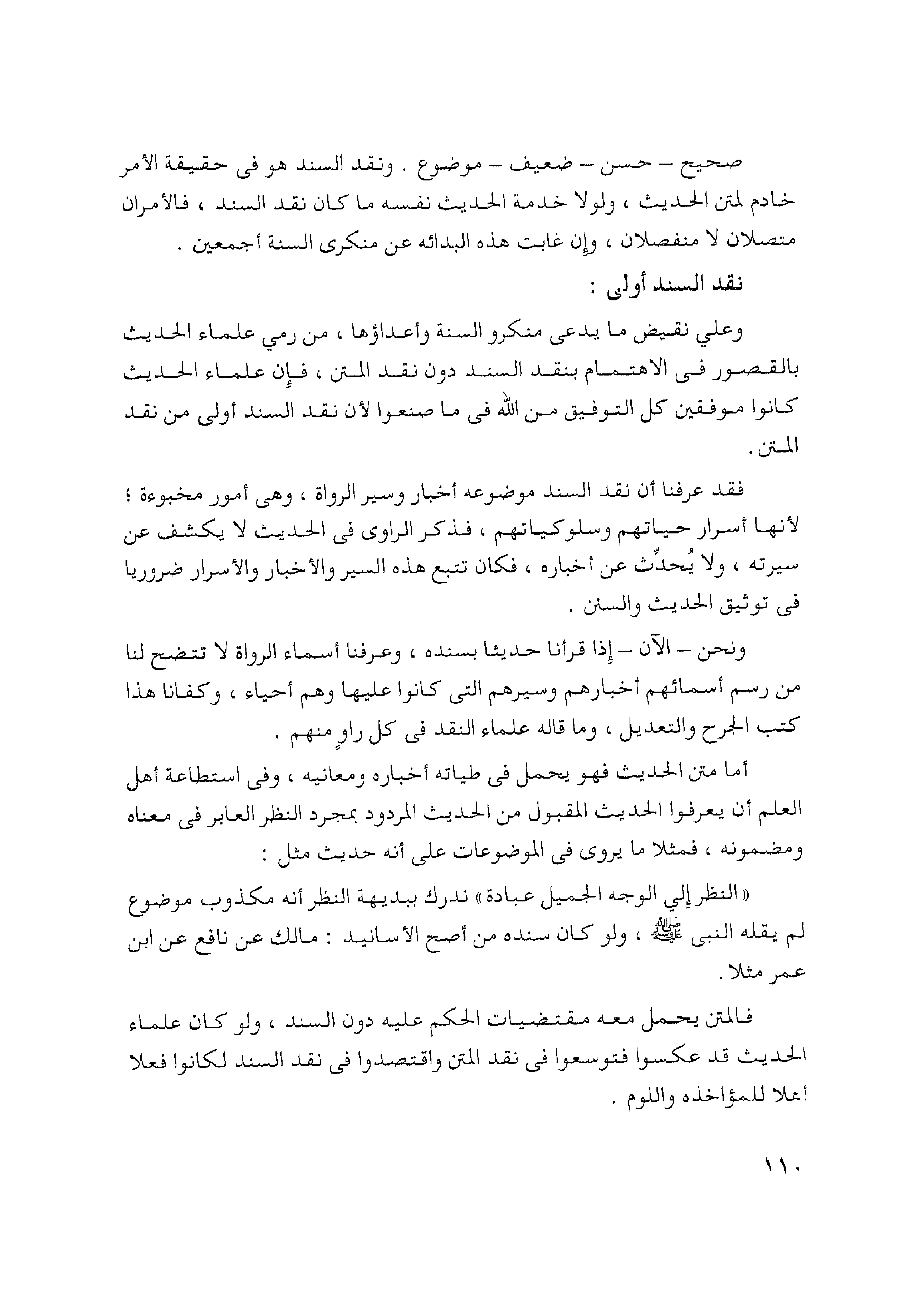 "النظر إلى الوجه الجميل عبادة" ندرك ببديهة النظر أنه مكذوب موضوع لم يقله النبي - صلى الله عليه وسلم -، ولو كان سنده من أصح الأسانيد: مالك عن نافع عن ابن عمر مثلا.