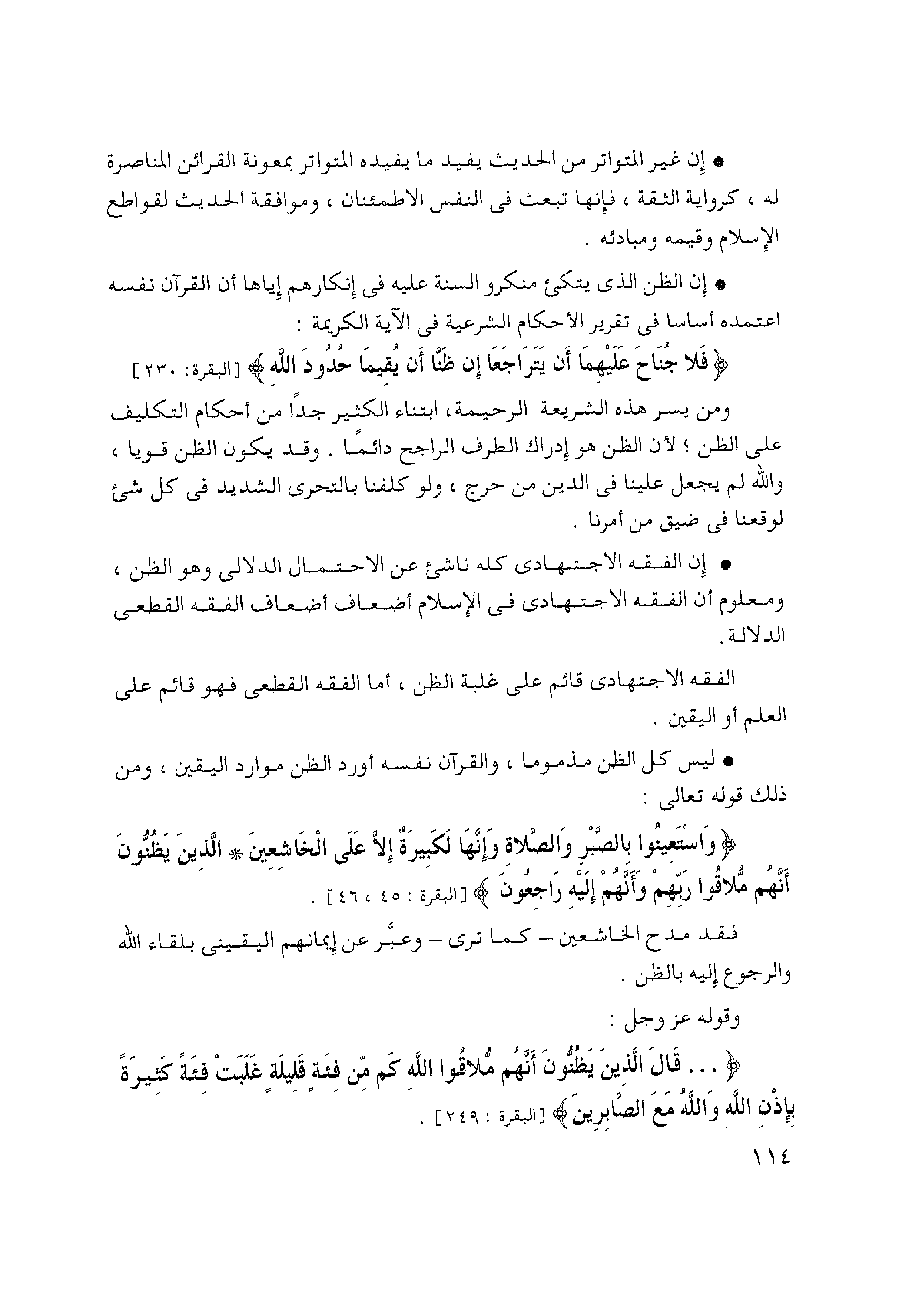 * إن الفقه الاجتهادي كله ناشئ عن الاحتمال الدلالي وهو الظن، ومعلوم أن الفقه الاجتهادي في الإسلام أضعاف أضعاف الفقه القطعي الدلالة.
