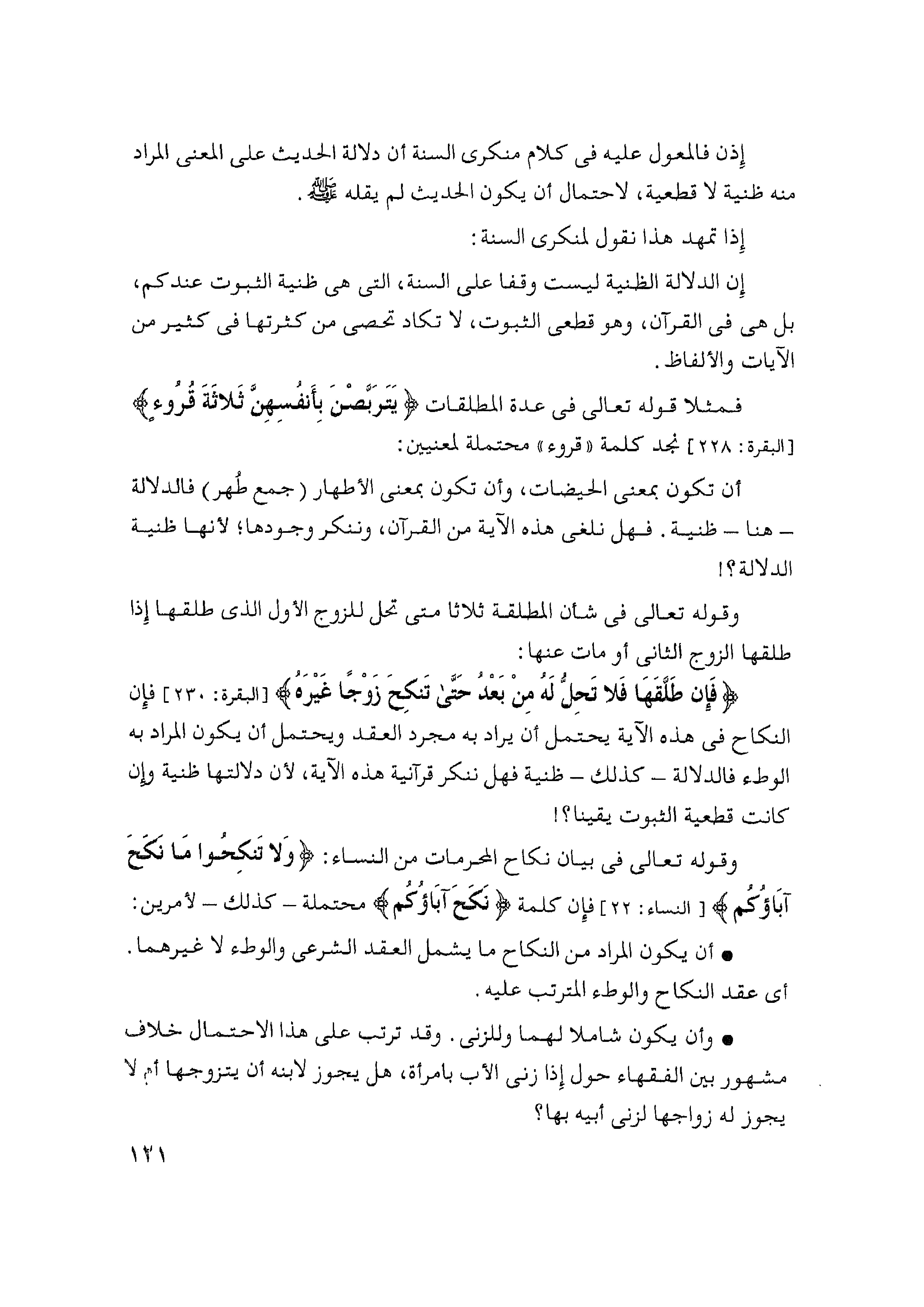 {فَإِنْ طَلَّقَهَا فَلَا تَحِلُّ لَهُ مِنْ بَعْدُ حَتَّى تَنْكِحَ زَوْجًا غَيْرَهُ} [البقرة: 230] فإن النكاح في هذه الآية يحتمل أن يراد به مجرد العقد ويحتمل أن يكون المراد به الوطء فالدلالة - كذلك - ظنية فهل تنكر قرآنية هذه الآية، لأن دلالتها ظنية وإن كانت قطعية الثبوت يقيناً؟! د