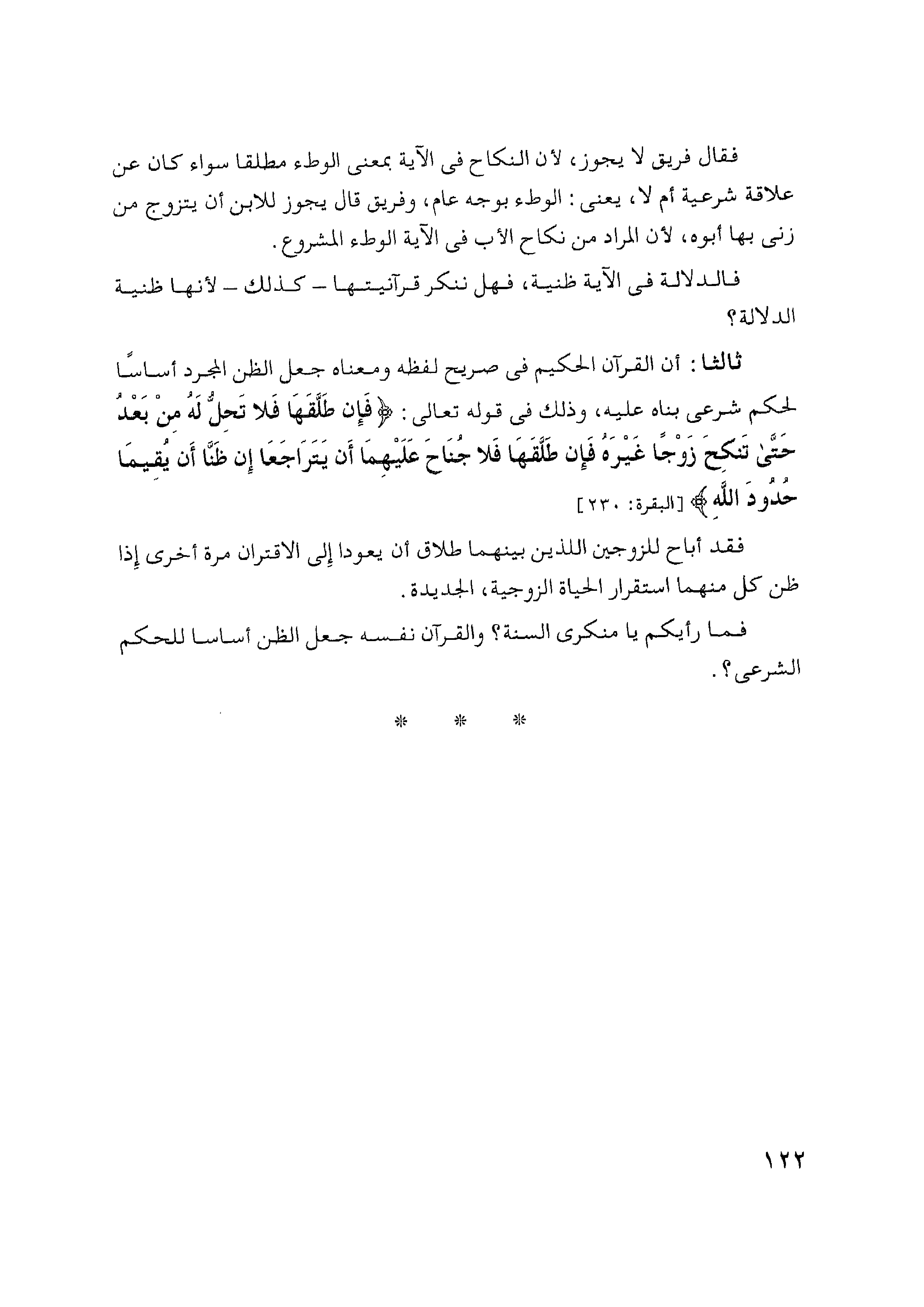 ثالثاً: أن القرآن الحكيم في صريح لفظه ومعناه جعل الظن المجرد أساساً لحكم شرعي بناه عليه، وذللك في قوله تعالى: {فَإِنْ طَلَّقَهَا فَلَا تَحِلُّ لَهُ مِنْ بَعْدُ حَتَّى تَنْكِحَ زَوْجًا غَيْرَهُ فَإِنْ طَلَّقَهَا فَلَا جُنَاحَ عَلَيْهِمَا أَنْ يَتَرَاجَعَا إِنْ ظَنَّا أَنْ يُقِيمَا حُدُودَ اللَّهِ} [البقرة: 230]