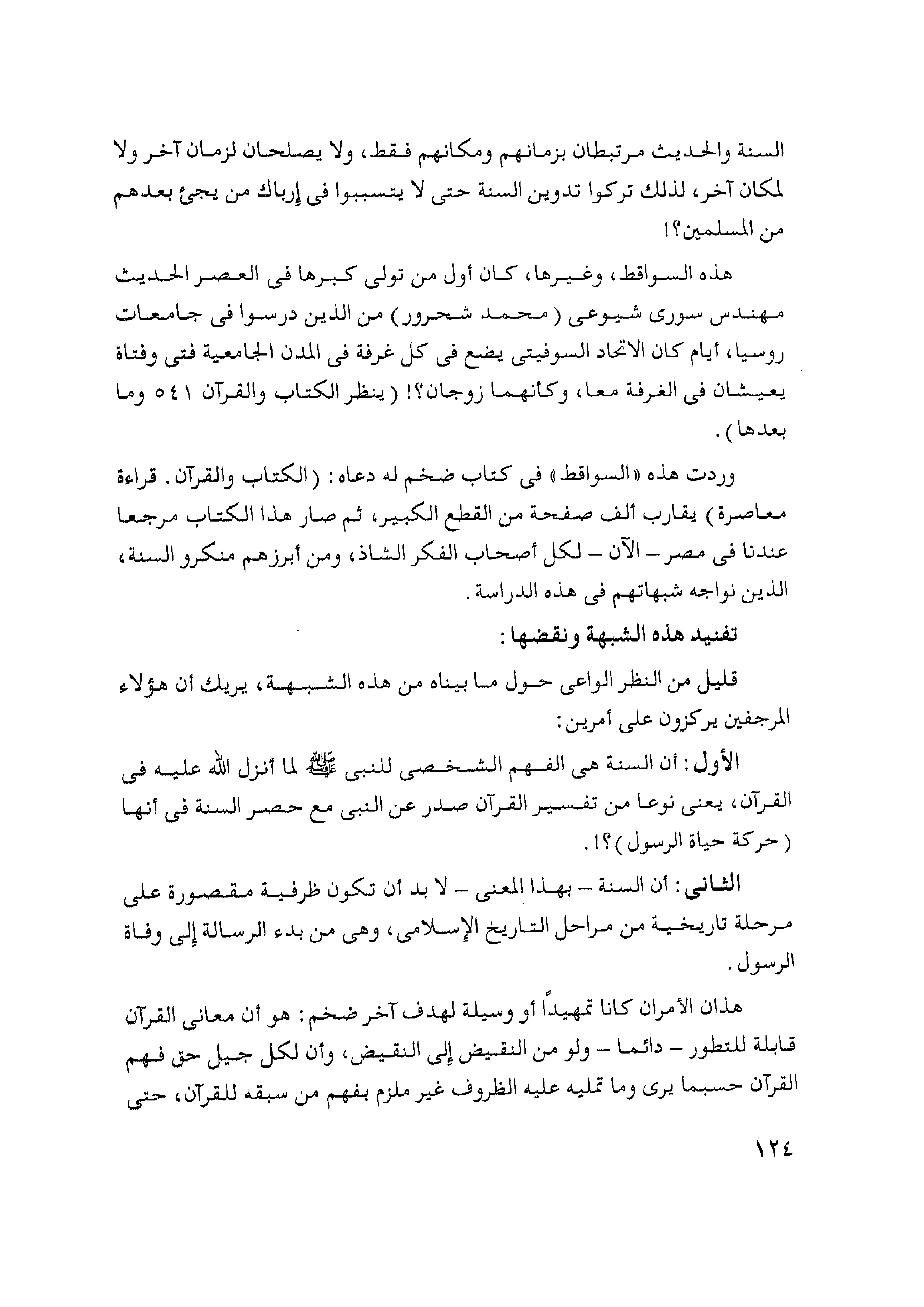 وردت هذه "السواقط" في كتاب ضخم له دعاه: (الكتاب والقرآن. قراءة معاصرة) يقارب ألف صفحة من القطع الكبير، ثم صار هذا الكتاب مرجعاً عندنا في مصر - الآن - لكل اصحاب الفكر الشاذ ومن أبرزهم منكرو السنة، الذين نواجه شبهاتهم في هذه الدراسة.