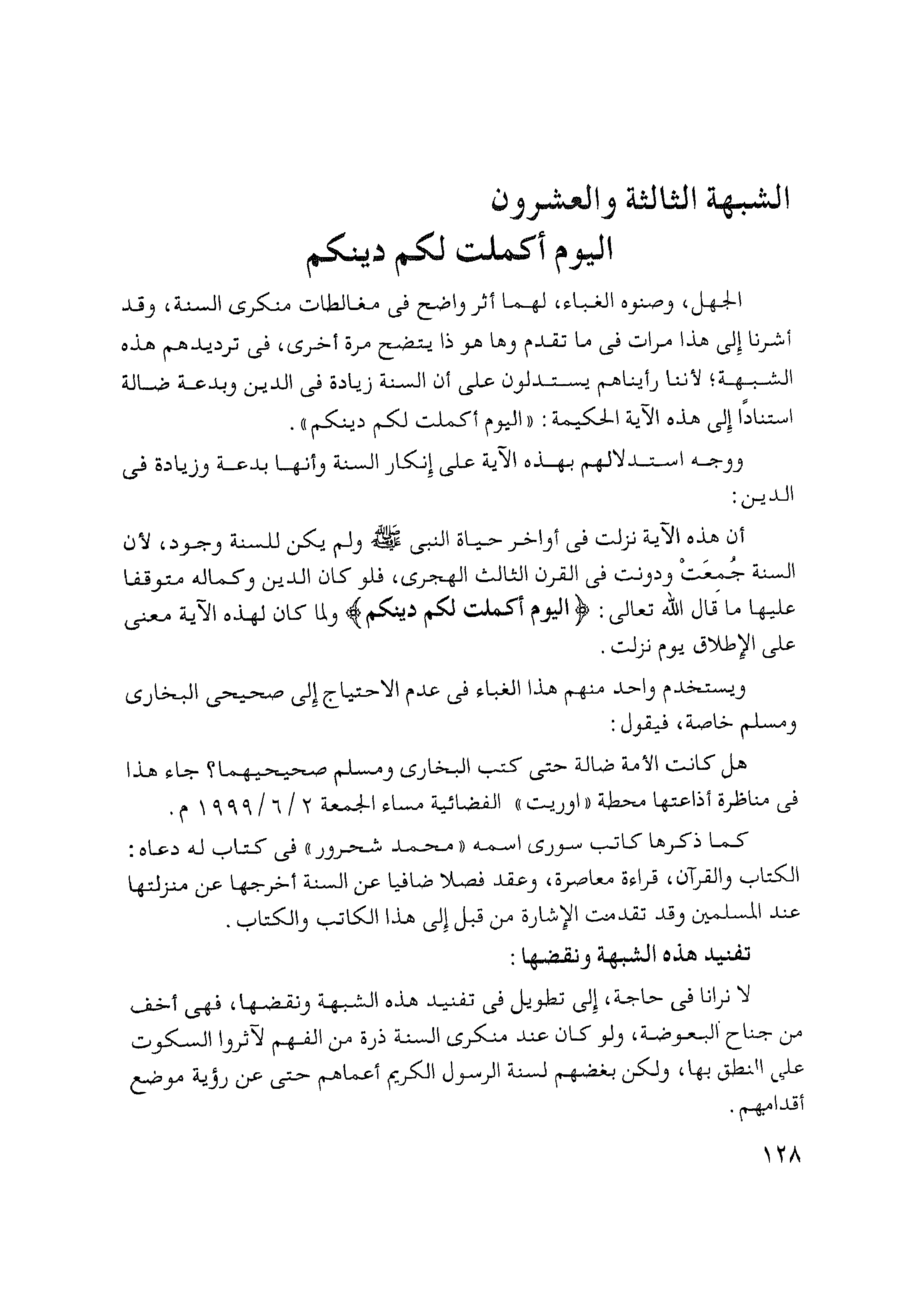 الشبهة الثالثة والعشرون (الْيَوْمَ أَكْمَلْتُ لَكُمْ دِينَكُمْ)