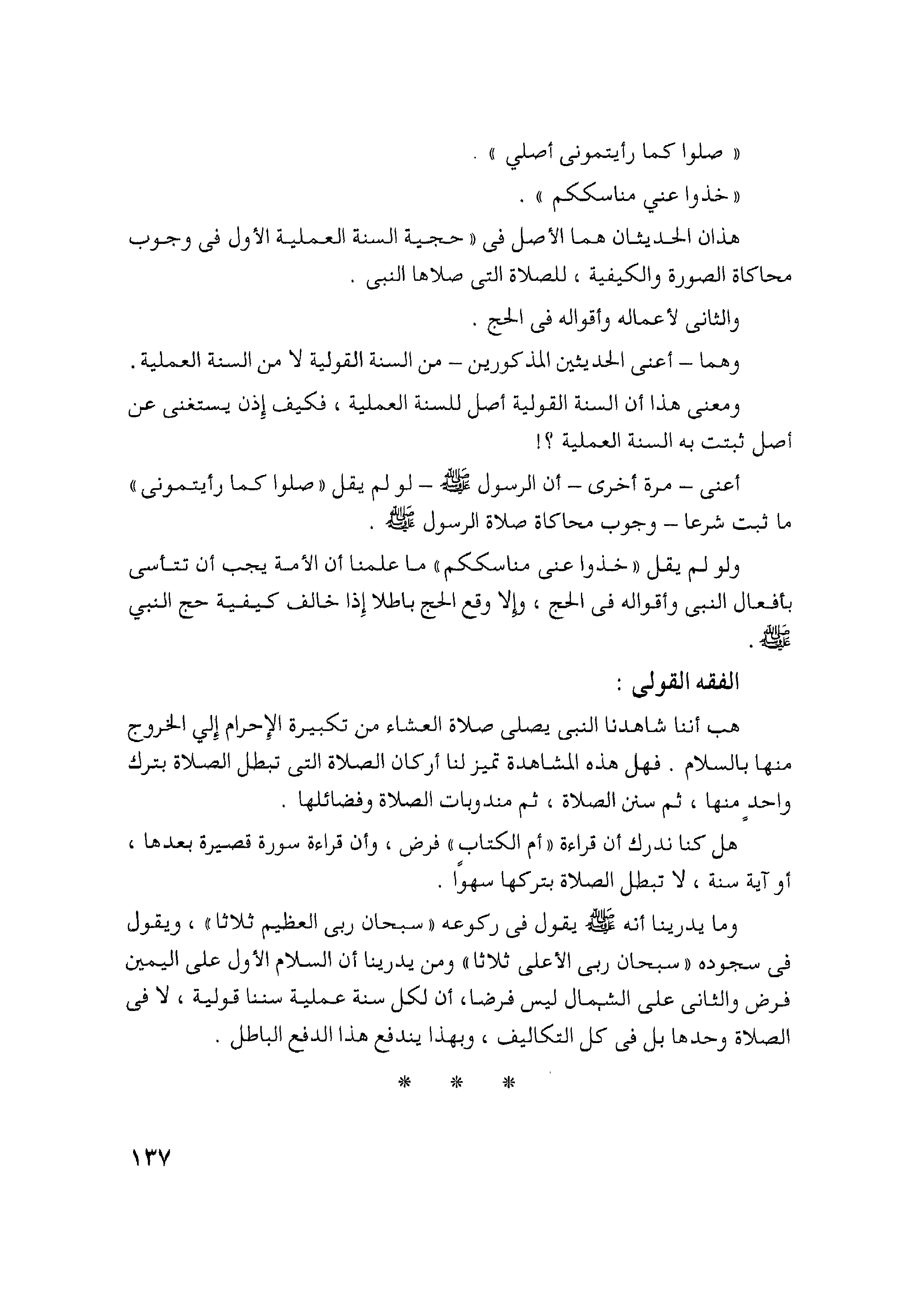 وما يجرينا أنه - صلى الله عليه وسلم - يقول في ركوعه "سبحان ربي العظيم ثلاثاً"، ويقول في سجوده "سبحان ربس الأعلى ثلاثاً" ومن يدرينا أن السلام الأول على اليمين فرض والثاني على الشمال ليس فرضاً، أن لكل سنة عملية سنناً قولية، لا في الصلاة وحدها بل في كل التكاليف، وبهذا يندفع هذا الدفع الباطل.