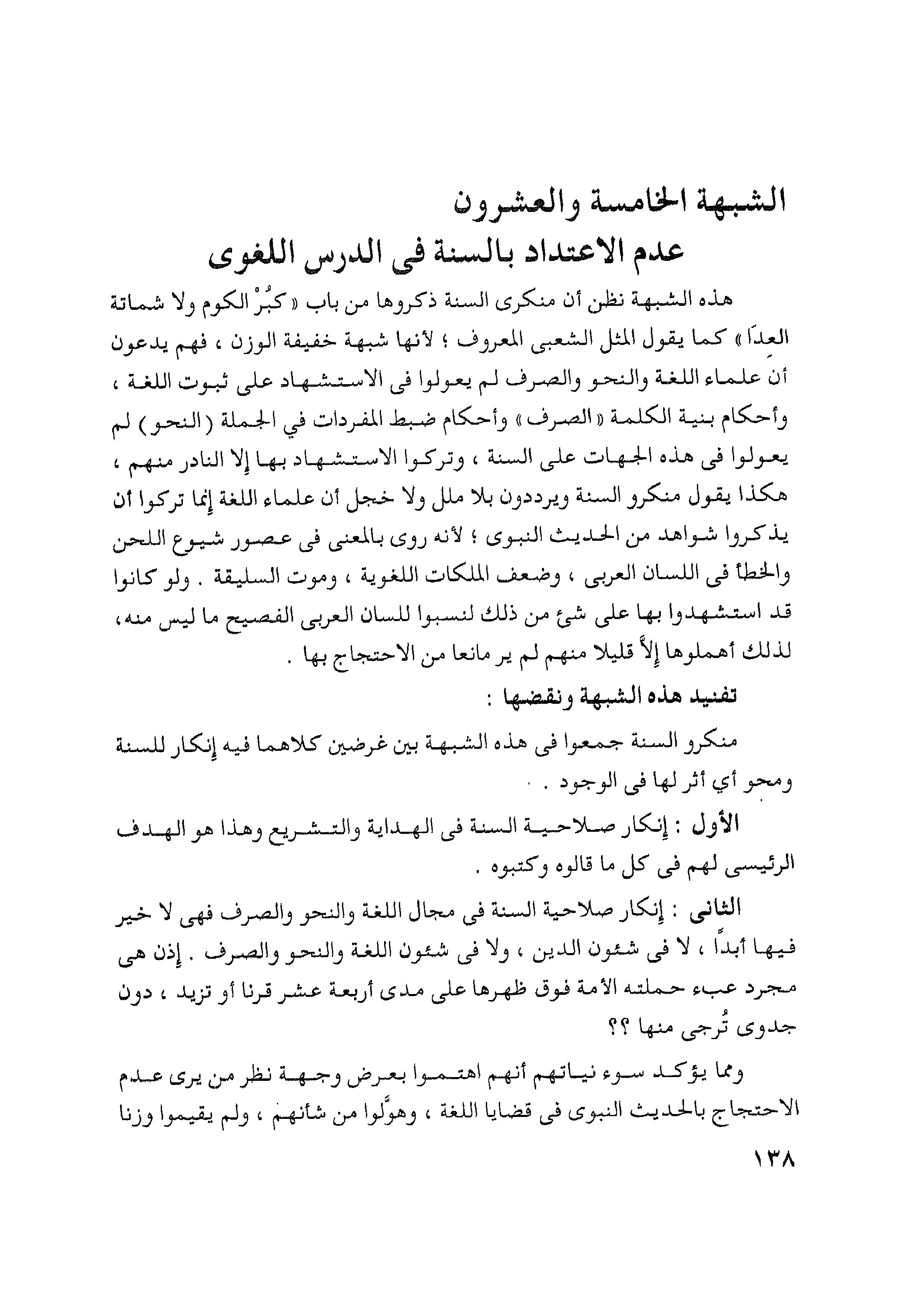 هذه الشبهة نظن أن منكري السنة ذكروها من باب "كبُرْ الكوم ولا شماتة العِدَا" كما يقول المثل الشعبي المعروف؛ لأنها شبهة خفيفة الوزن، فهم يدعون أن علماء اللغة والنحو والصرف لم يعولوا في الاستشهاد على ثبوت اللغة، وأحكام بنية الكلمة "الصرف" وأحكام ضبط المفردات في الجملة (النحو) لم يعولوا فذ هذه الجهات على السنة، وتركوا الاستشهاد بها إلا النادر منهم، هكذا يقول منكرو الجهات ويرددون بلا ملل ولا خجل أن علماء اللغة إنما تركوا أن يذكروا شواهد من الحديث النبوي، لأنه روى بالمعنى في عصور شيوع اللحن والخطأ في اللسان العربي، وضعف الملكات اللغوية، وموت السليقة، ولو كانوا قد استسهدوا بها على شيء من ذلك لنسبوا للسان العربي الفصيح ما ليس منه، لذلك أهملوها إلا قليلاً منهم لم ير مانعاً من الاحتجاج بها.