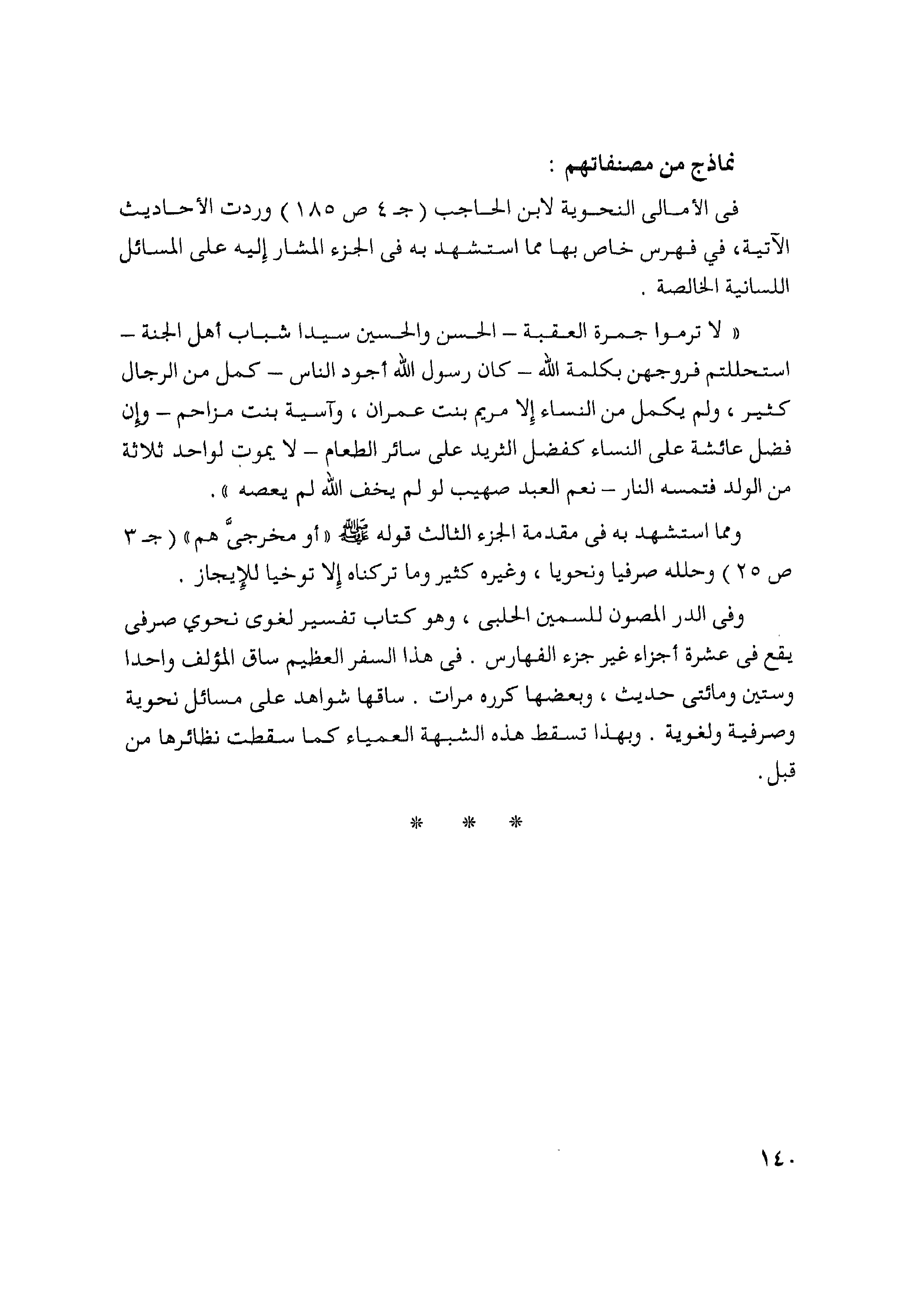 في الأمالى النحوية لأبن الحاجب (جـ 4 ص 185) وردت الأحاديث الاتية، في فهرس خاص بها مما استشهد به في الجزء المشار إليه على المسائل اللسانية الخالصة.