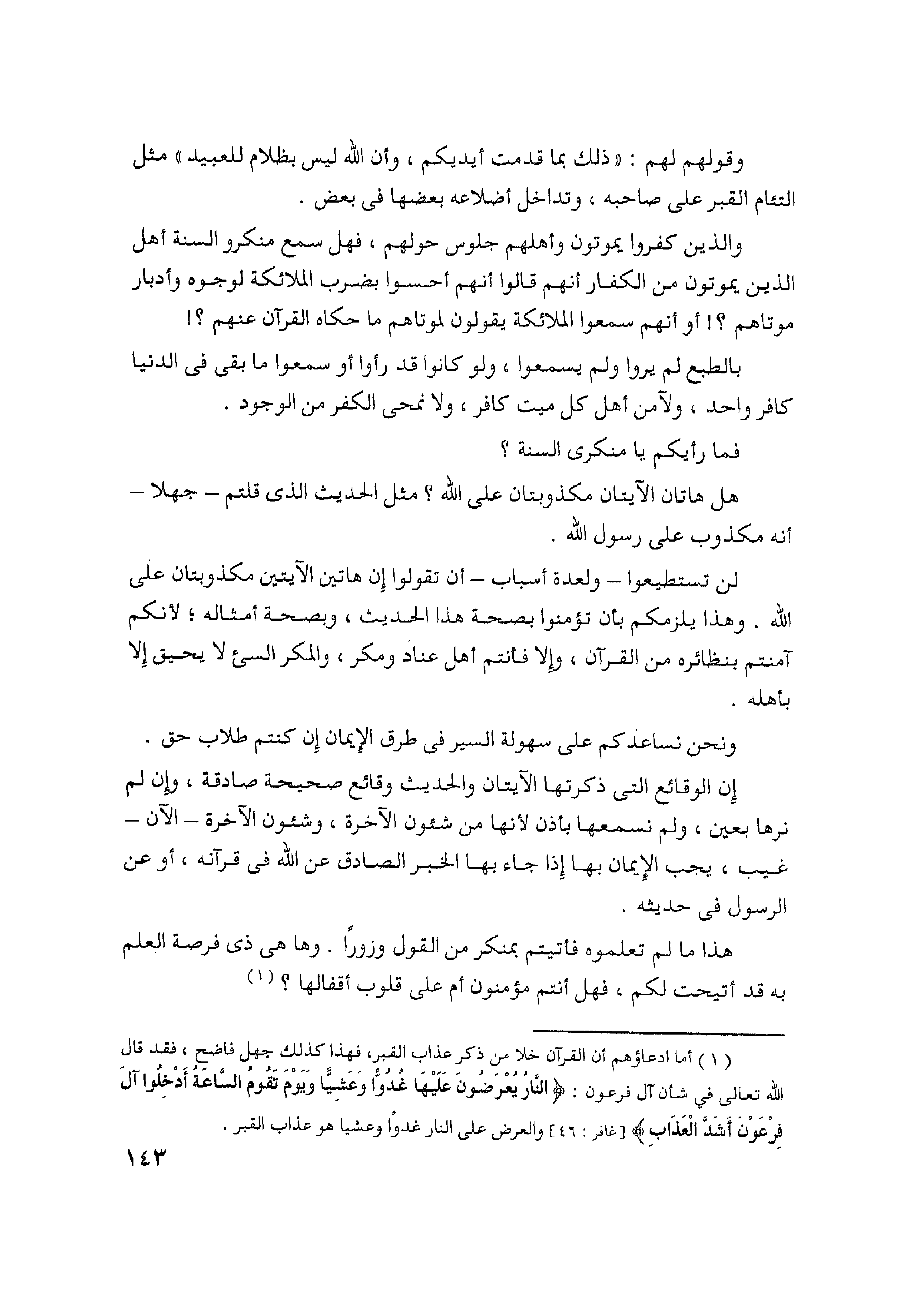 إن الوقائع التي ذكرتها الآيتان والحديث وقائع صحيحة صادفة، وإن لم نرها بعين، ولم نسمعها بأذن لأنها من شئون الآخرة، وشئون الآخرة - الآن - غيب، يجب الإيمان بها إذا جاء بها الخبر الصادق عن الله في قرآنه، أو عن الرسول في حديثه.