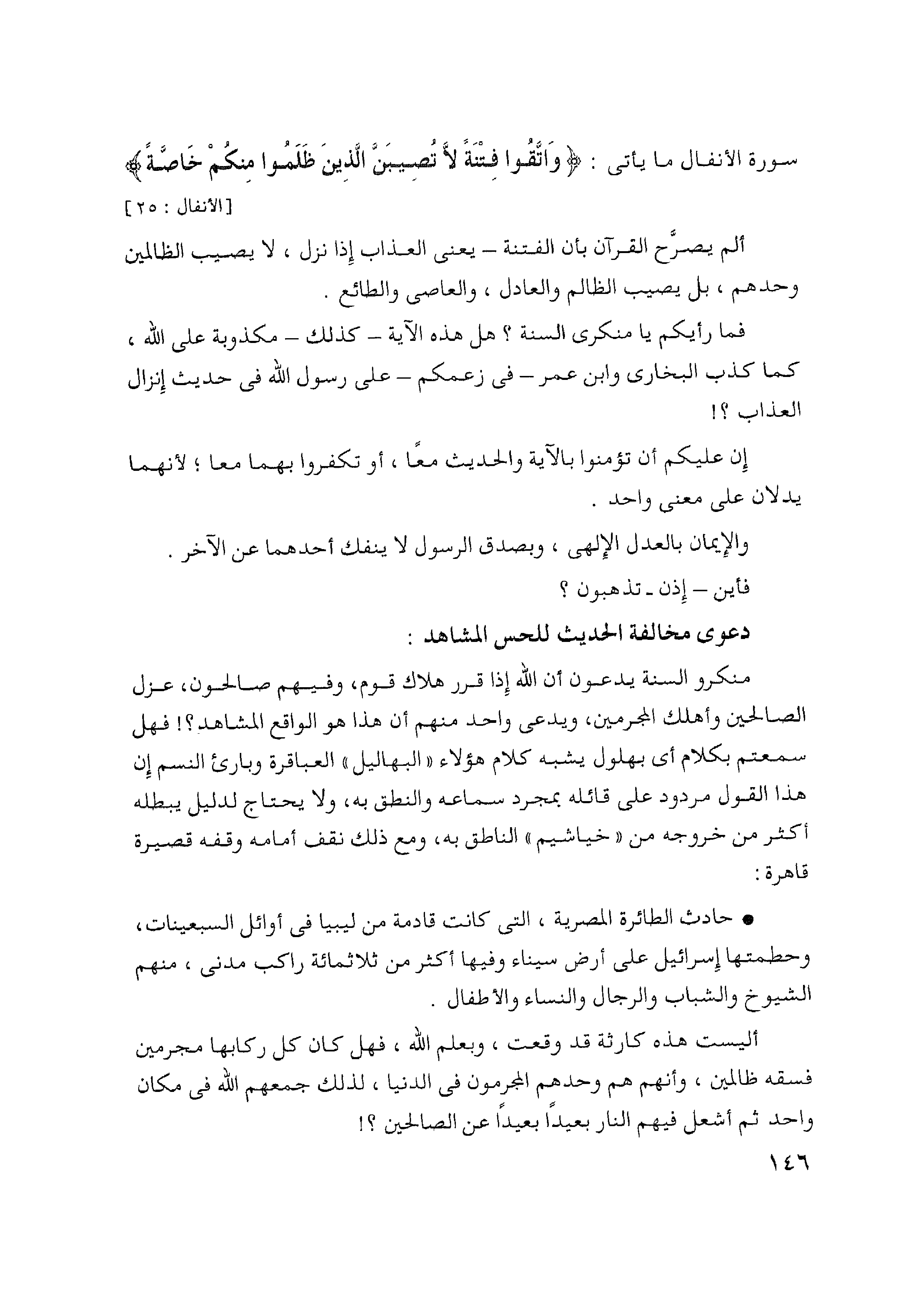 منكرو السنة يدعون أن الله إذا قرر هلاك قوم، وفيهم صالحون، عزل الصالحين وأهلك المجرمين، ويدعى واحد منهم أن هذا هو الواقع المشاهد؟! فهل سمعتم بكلام اي بهلول يشبه كلام هؤلاء "البهاليل" العباقرة وبارئ النسم إن هذا القول مردود على قائله بمجرد سماعه والنطق به، ولا يحتاج لدليل يبطله أكثر من خروجه من "خياشيم" الناطق به، ومع ذلك نقف أمامه وقفه قصيرة قاهرة: