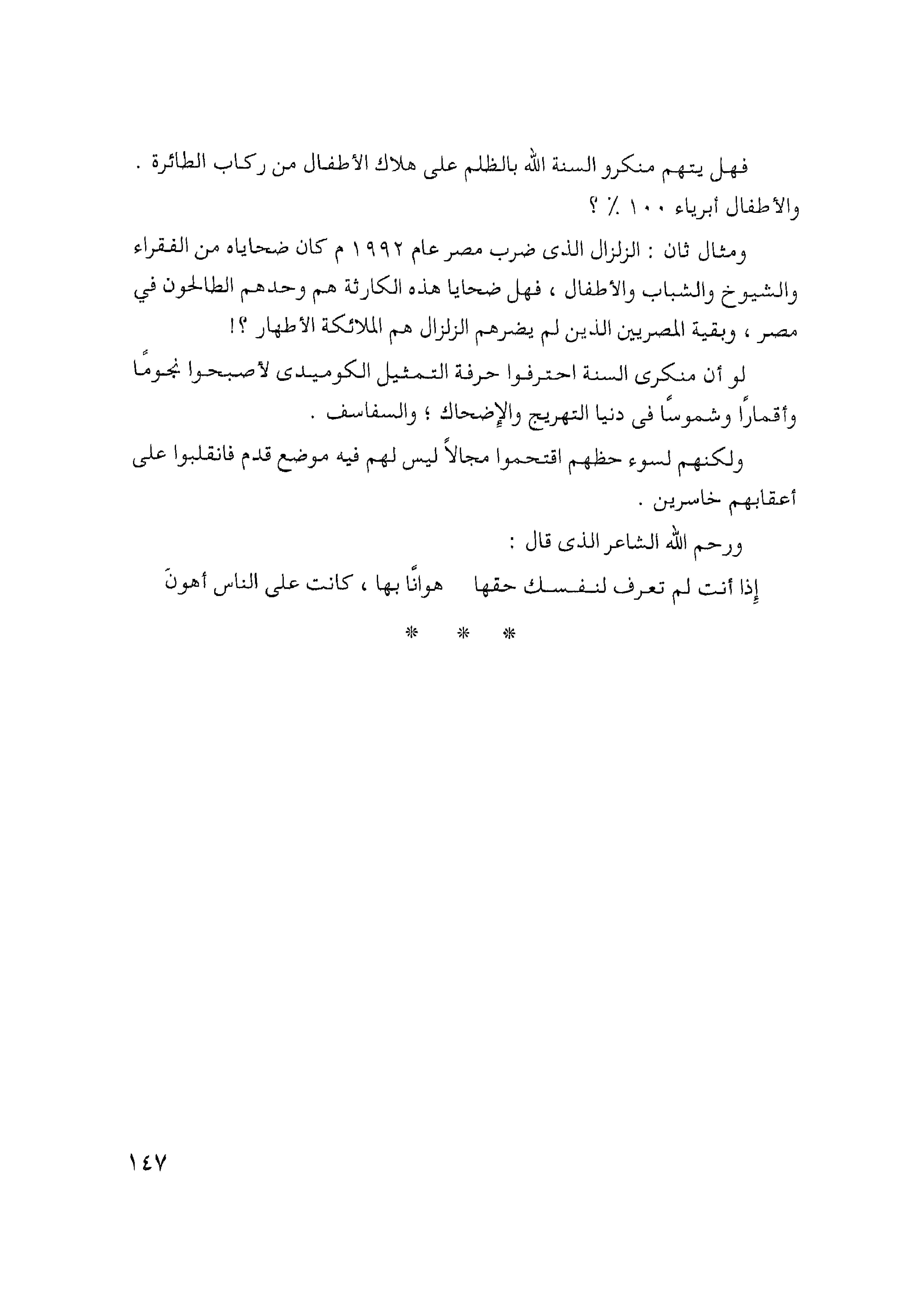 ومثال ثان: الزلزال الذي ضرب مصر عام 1992م كان ضحاياه من الفقراء والشيوخ والشباب والأطفال، فهل ضحايا هذه الكارثة هم وحدهم الطالحون في مصر، وبقية المصريين الذين لم يضرهم الزلزال هم الملائكة الأطهار؟!