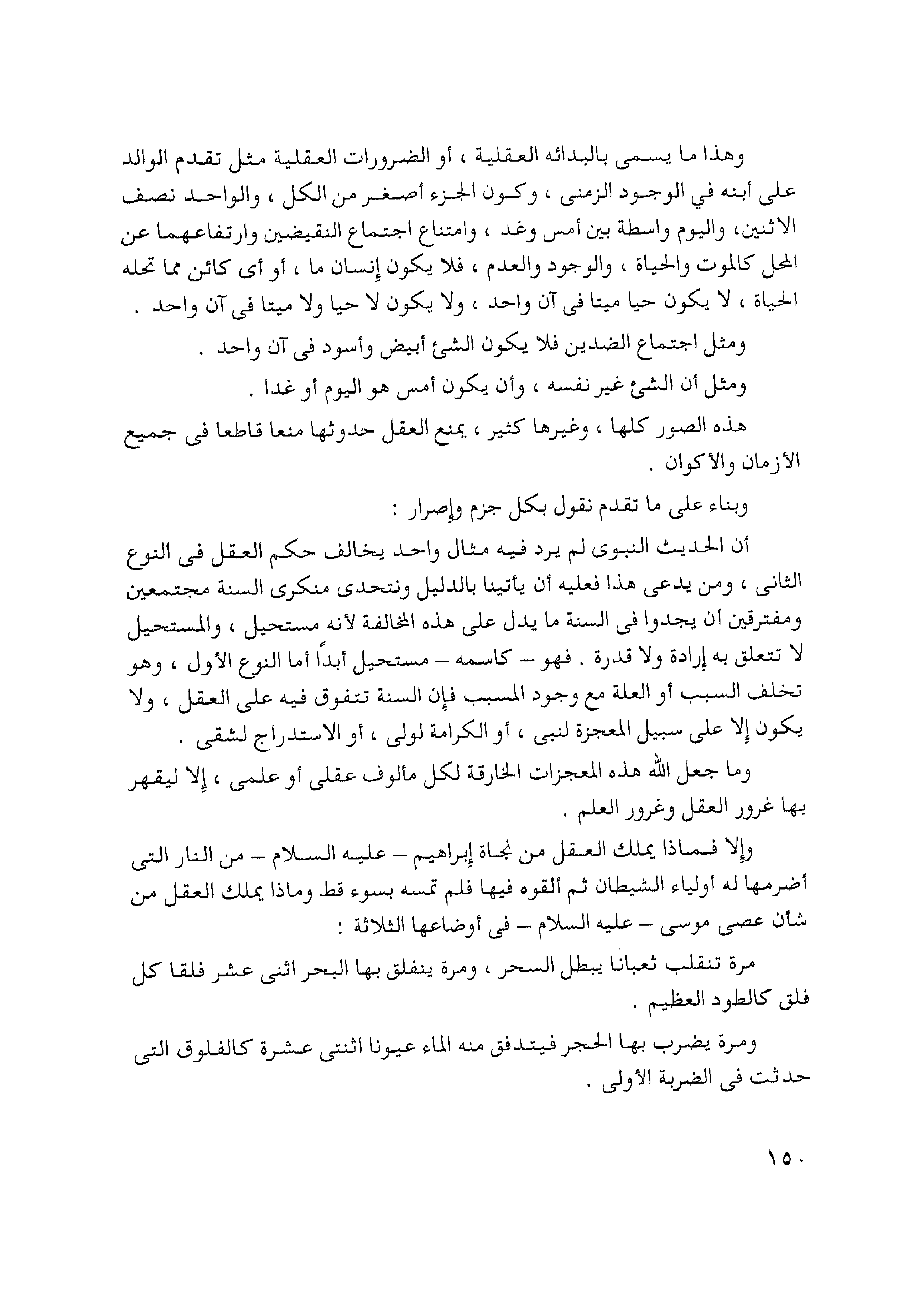 وإلا فماذا يملك العقل من نجاة إبراهيم - عليه السلام - من النار التي أضرمها له أولياء الشيطان ثم ألقوه فيها فلم تمسه بسوء قط وماذا يملك العقل من شأن عصى موسى - عليه السلام - في أوضاعها الثلاثة: