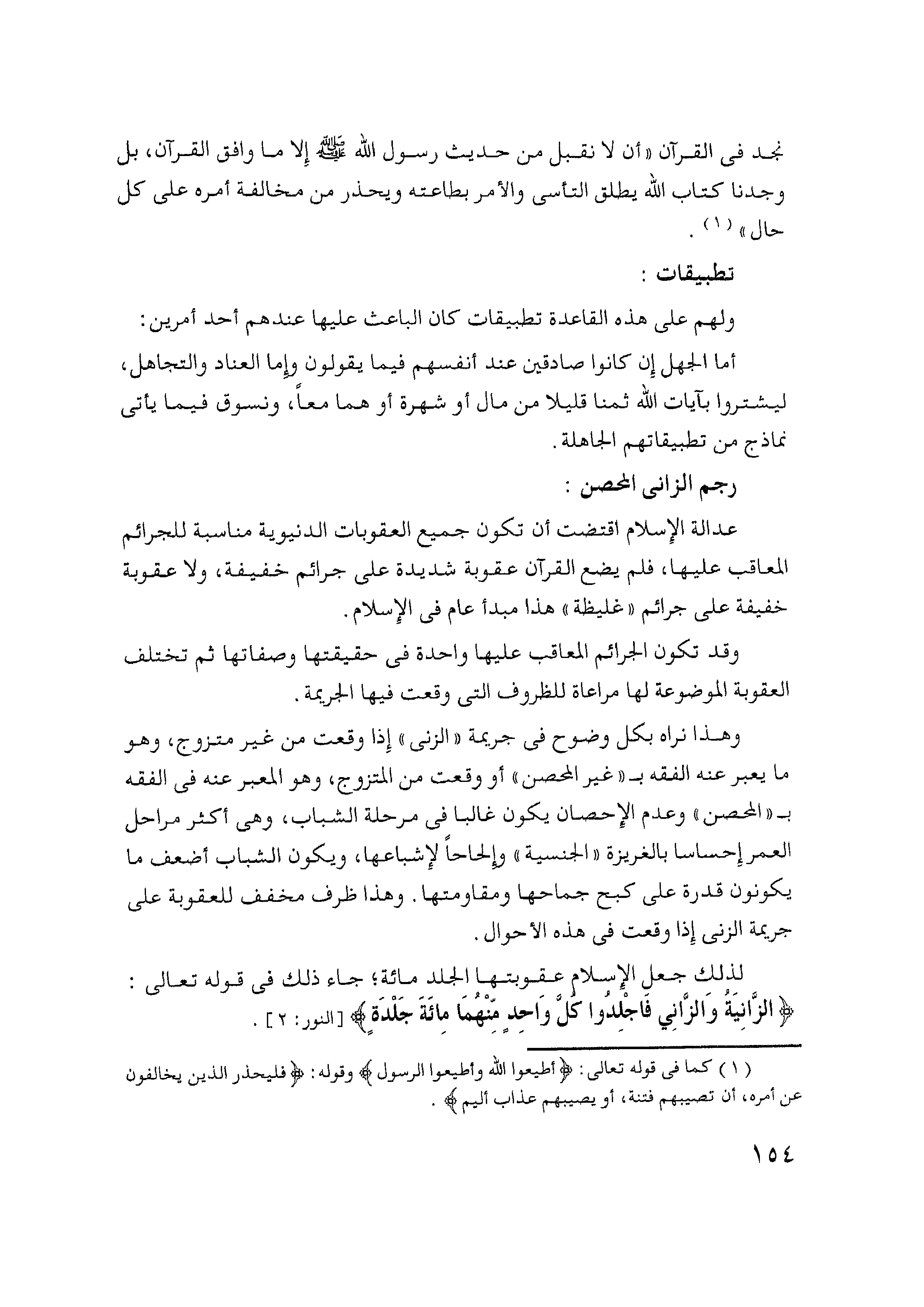 عدالة الإسلام اقتضت أن تكون جميع العقوبات الدنيوية مناسبة للجرائم المعاقب عليها، فلم يضع القرآن عقوبة شديدة على جرائم خفيفة، ولا عقوبة خفيفة على جرائم "غليظة" هذا مبدأ عام في الإسلام.