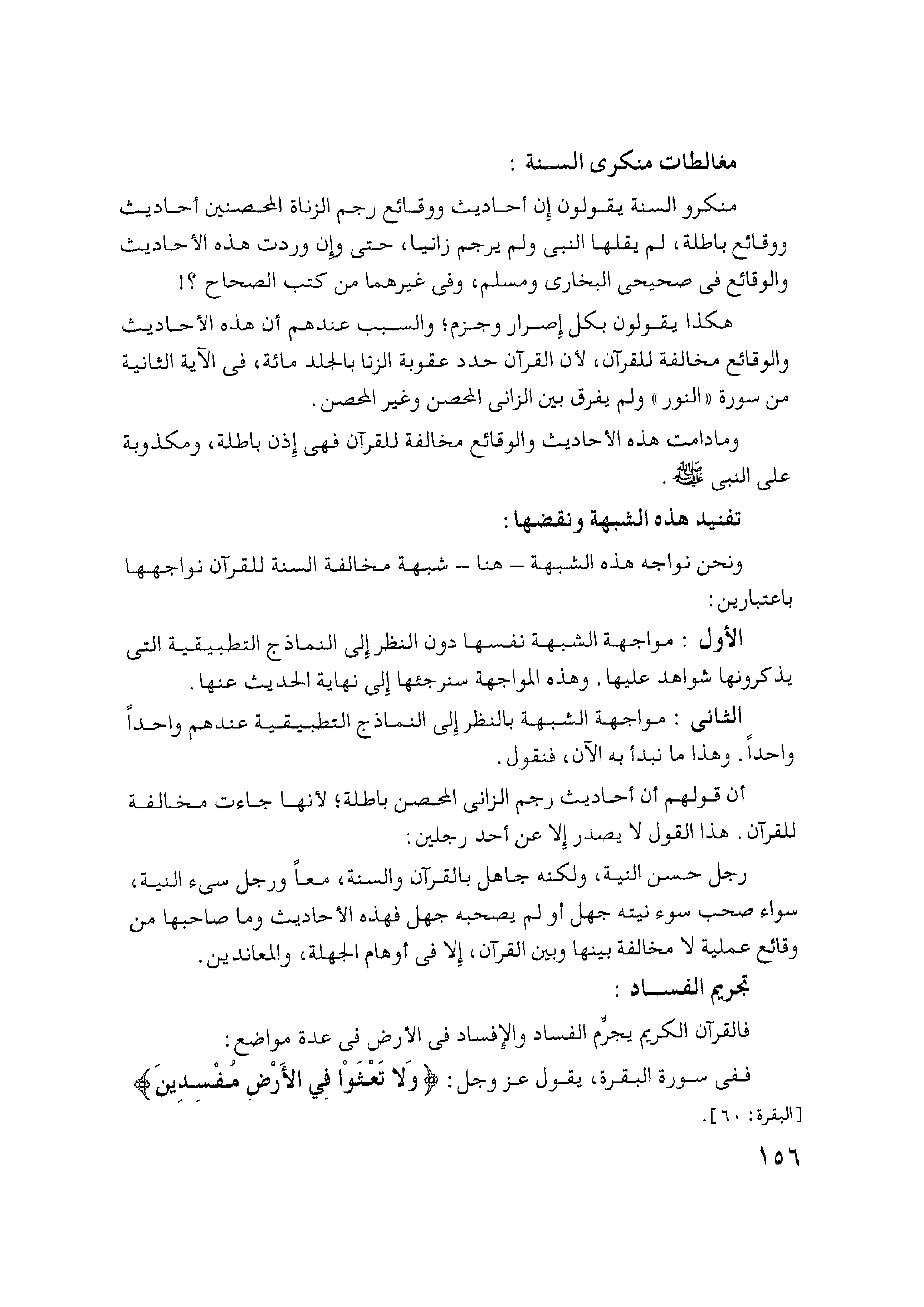 أن قولهم أن أحاديث رجم الزاني المحصن باطلة؛ لأنها جاءت مخالفة للقرآن. هذا القول لا يصدر إلا عن أحد رجلين:
