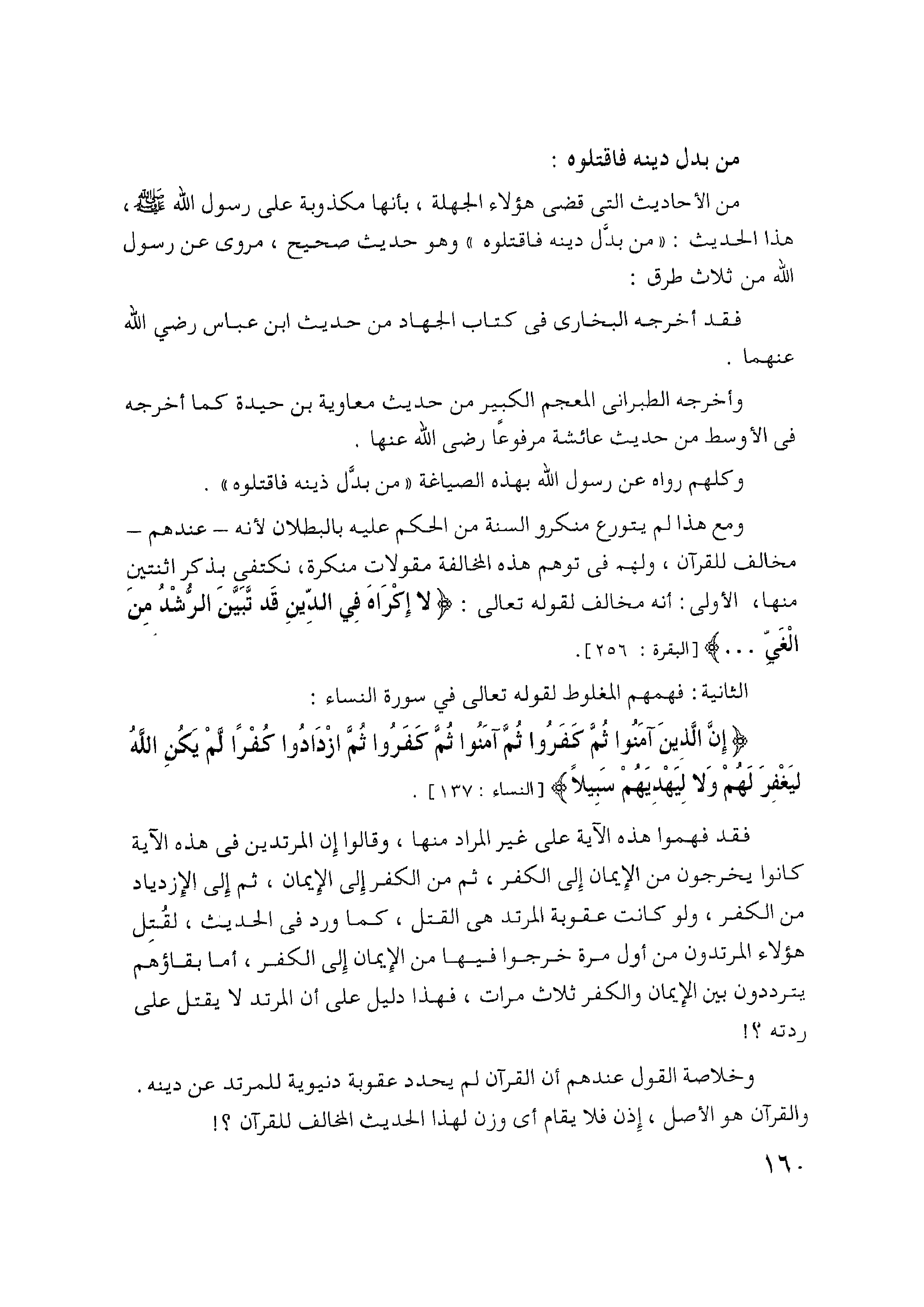 وخلاصة القول عندهم أن القرآن لم يحدد عقوبة دنيوية للمريد عن دينه. والقرآن هو الأصل، إذن فلا يقام أي وزن لهذا الحديث المخالف للقرآن؟!