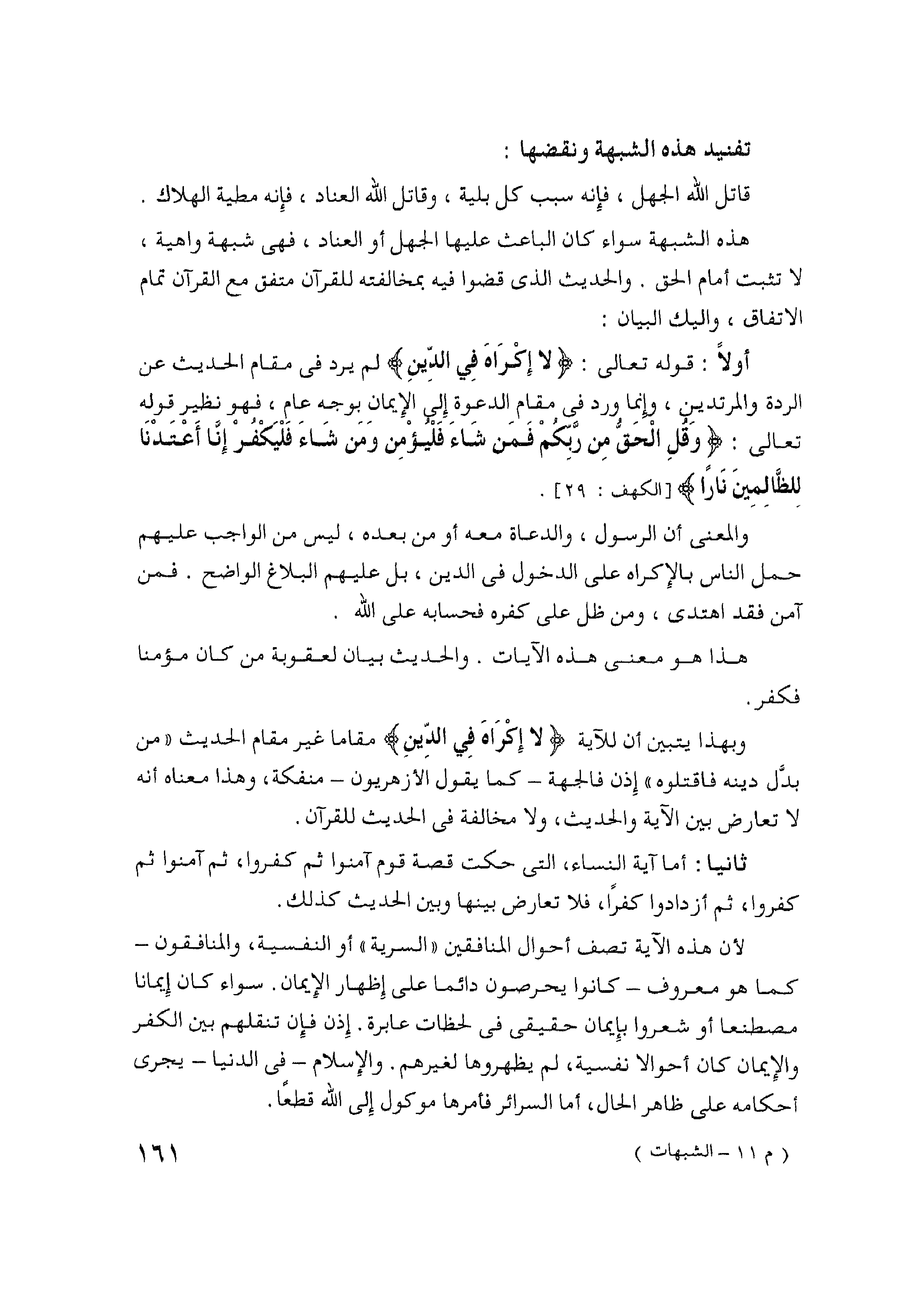 وبهذا يتبسن أن للآية {لَا إِكْرَاهَ فِي الدِّينِ} مقاماً غير مقام الحديث "من بدَّل يدنه فاقتلوه" إذن فالجهة - كما يقول الأزهريون - منفكة، وهذا معناه أنه لا تعارض بين الآية والحديث، ولا مخالفة في الحديث للقرآن.