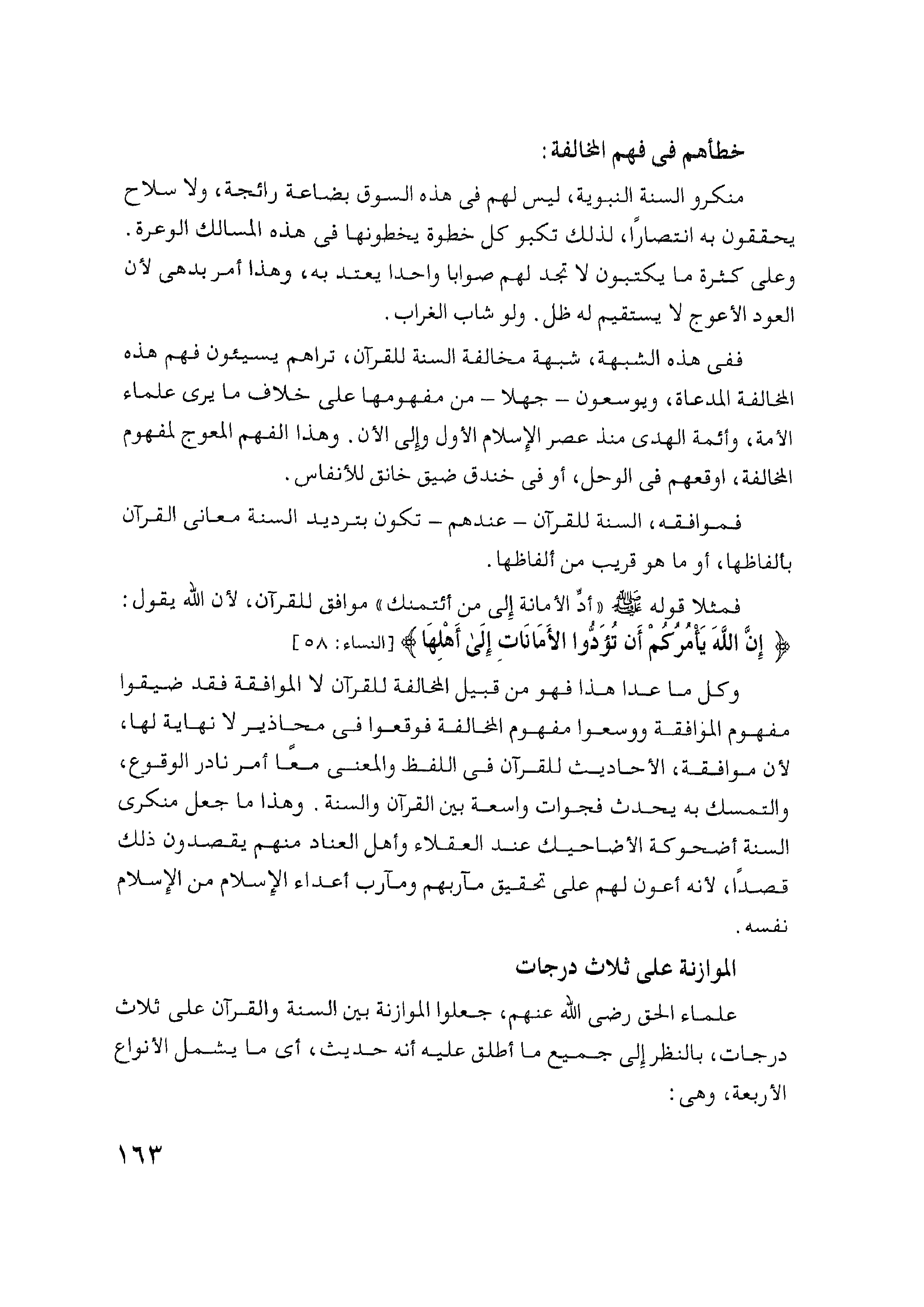 علماء الحق - رضي الله عنهم -، جعلوا الموازنة بين السنة والقرآن على ثلاث درجات، بالنظر إلى جميع ما أطلق عليه أنه حديث، أي ما يشمل الأنواع الأربعة، وهي: