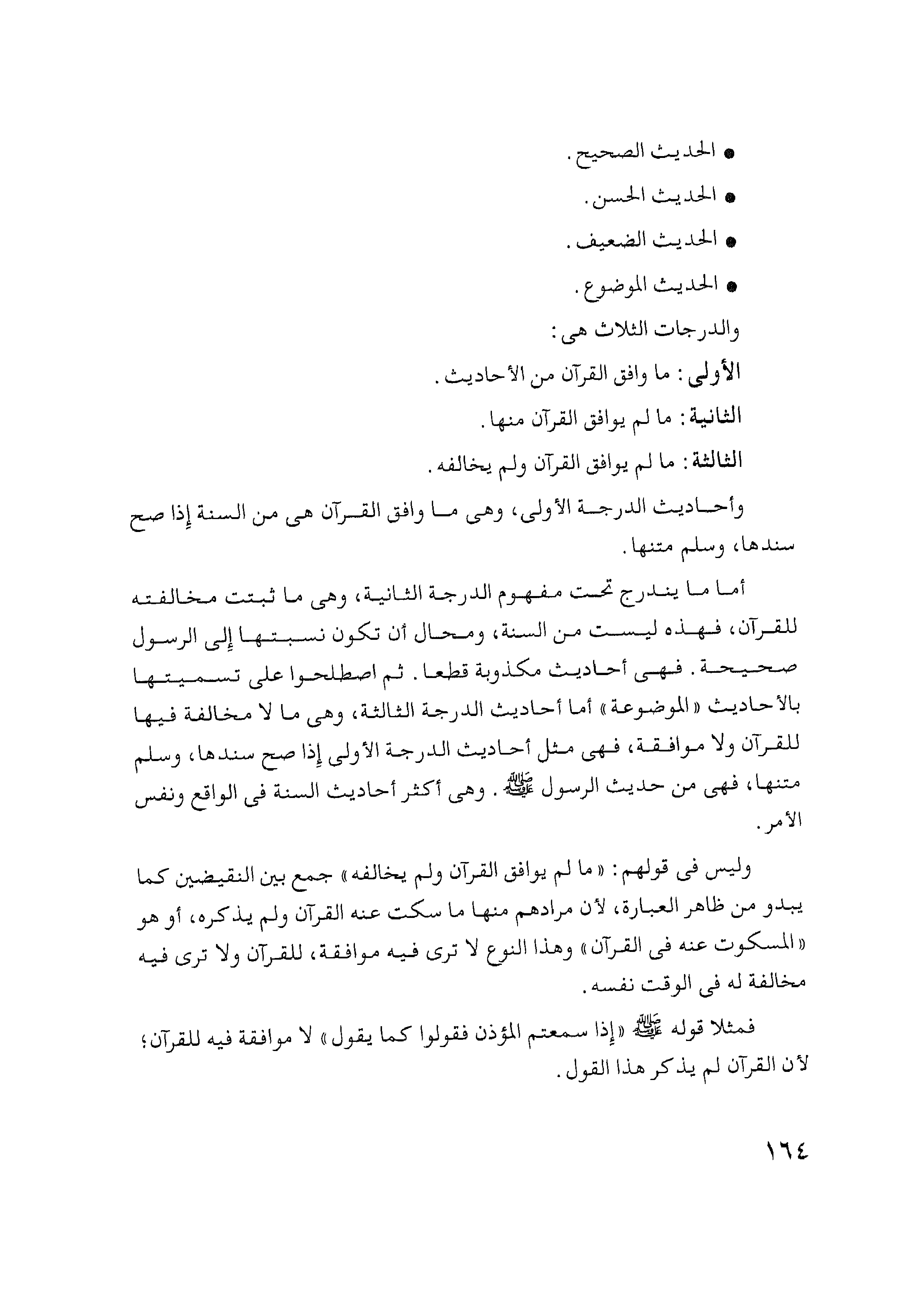 أما ما يندرج تحت مفهوم الدرجة الثانية، وهي ما ثبت مخالفته للقرآن، فهذه ليست من السنة، ومحال أن تكون نسبتها إلى الرسول صحيحة، فهي أحاديث مكذوبة قطعاً. ثم اصطلحوا على تسميتها بالأحاديث "الموضوعى" أما أحاديث الدرجة الثالثة، وعي ما لا مخالفة فيها للقرآن ولا موافقة، فهي مثل أحاديث الدرجة الأولى إذا صح سندها، وسلم متنها، فهي من حديث الرسول - صلى الله عليه وسلم -. وهي أكثر أحاديث السنة في الواقع ونفس الأمر.