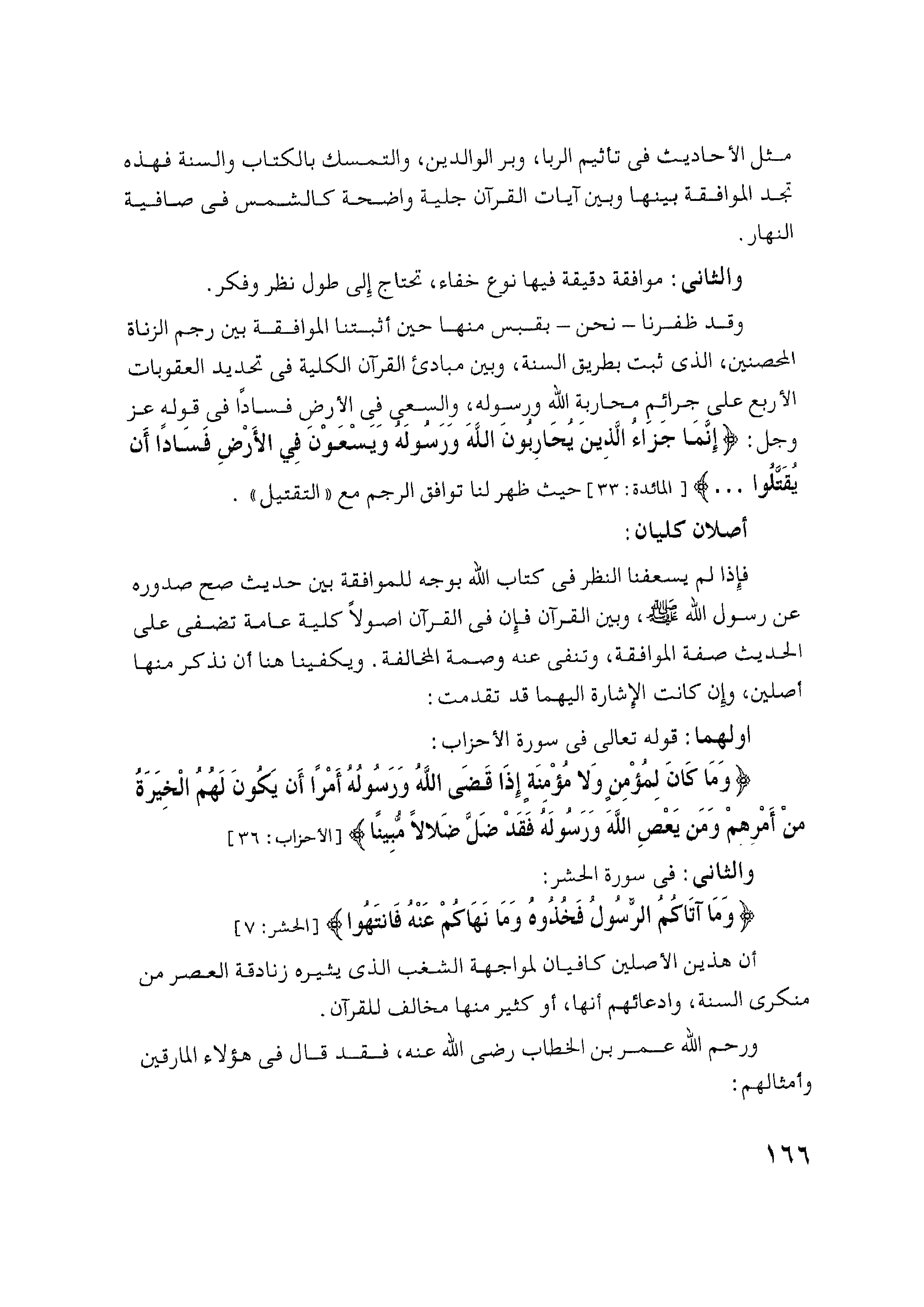 وقد ظفرنا - نحن - بقبس منها حين أثبتنا الموافقة بين رجم الزناة المحصنين، الذي ثبت بطريق السنة، وبين مبادئ القرآن الكلية في تحديد العقوبات الأربع على جرائم محاربة الله ورسوله، والسعي في الأرض فساداً في قوله - عز وجل -: {إِنَّمَا جَزَاءُ الَّذِينَ يُحَارِبُونَ اللَّهَ وَرَسُولَهُ وَيَسْعَوْنَ فِي الْأَرْضِ فَسَادًا أَنْ يُقَتَّلُوا....} [المائدة: 33] حيث ظخر لنا توافق الرجم مع "التقتيل".