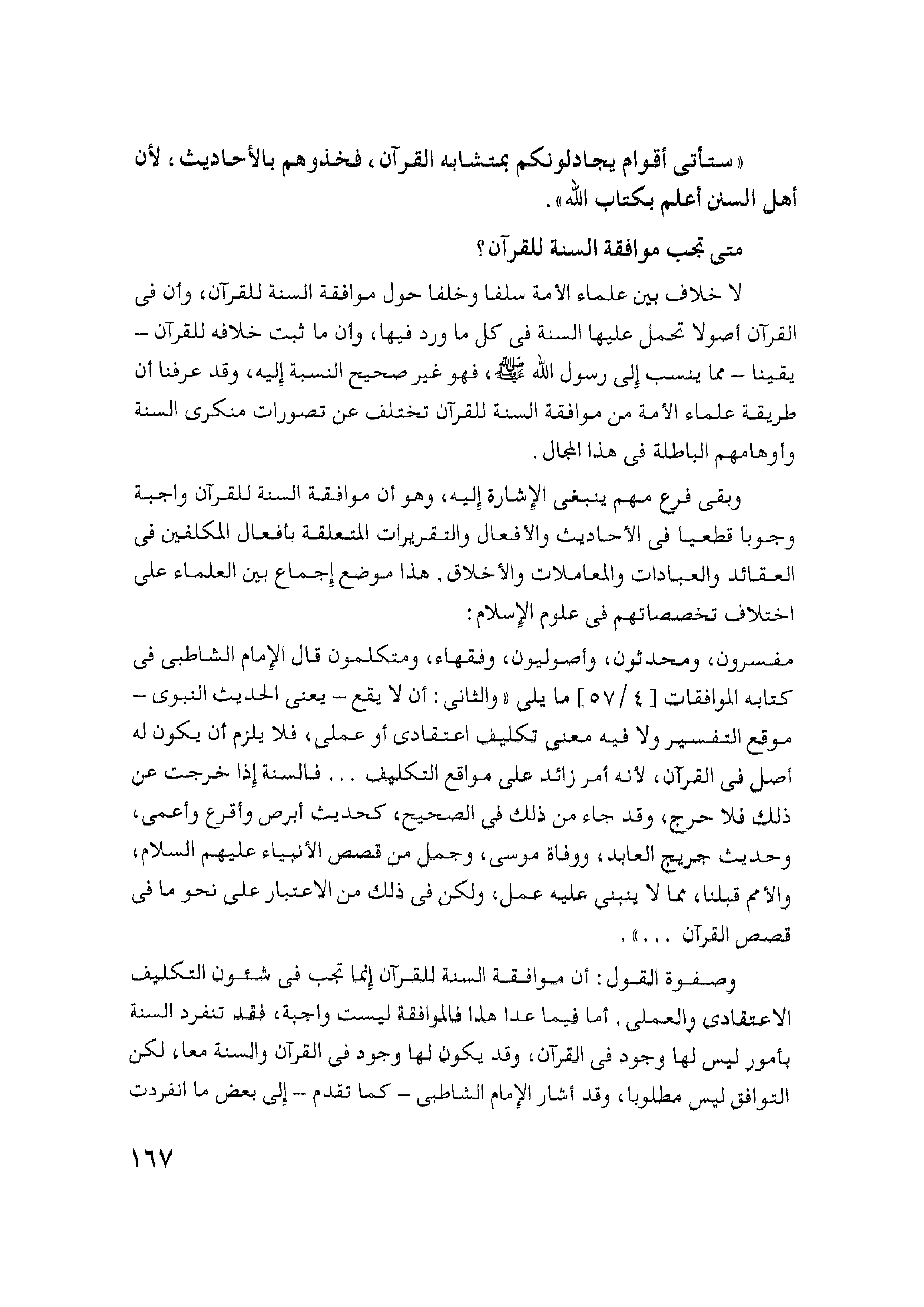 وبقى فرع مهم ينبغي الإشارة إليه، وهو أن موافقة السنة للقرآن واجبة وجوباً قطعياً في الأحاديث والأفعال والتقريرات المتعلقة بأفعال المكلفين في العقائد والعبادات والمعاملات والأخلاق. هذا موضع إجماع بين العلماء على اخالاف تخصصاتهم في علوم الإسلام: