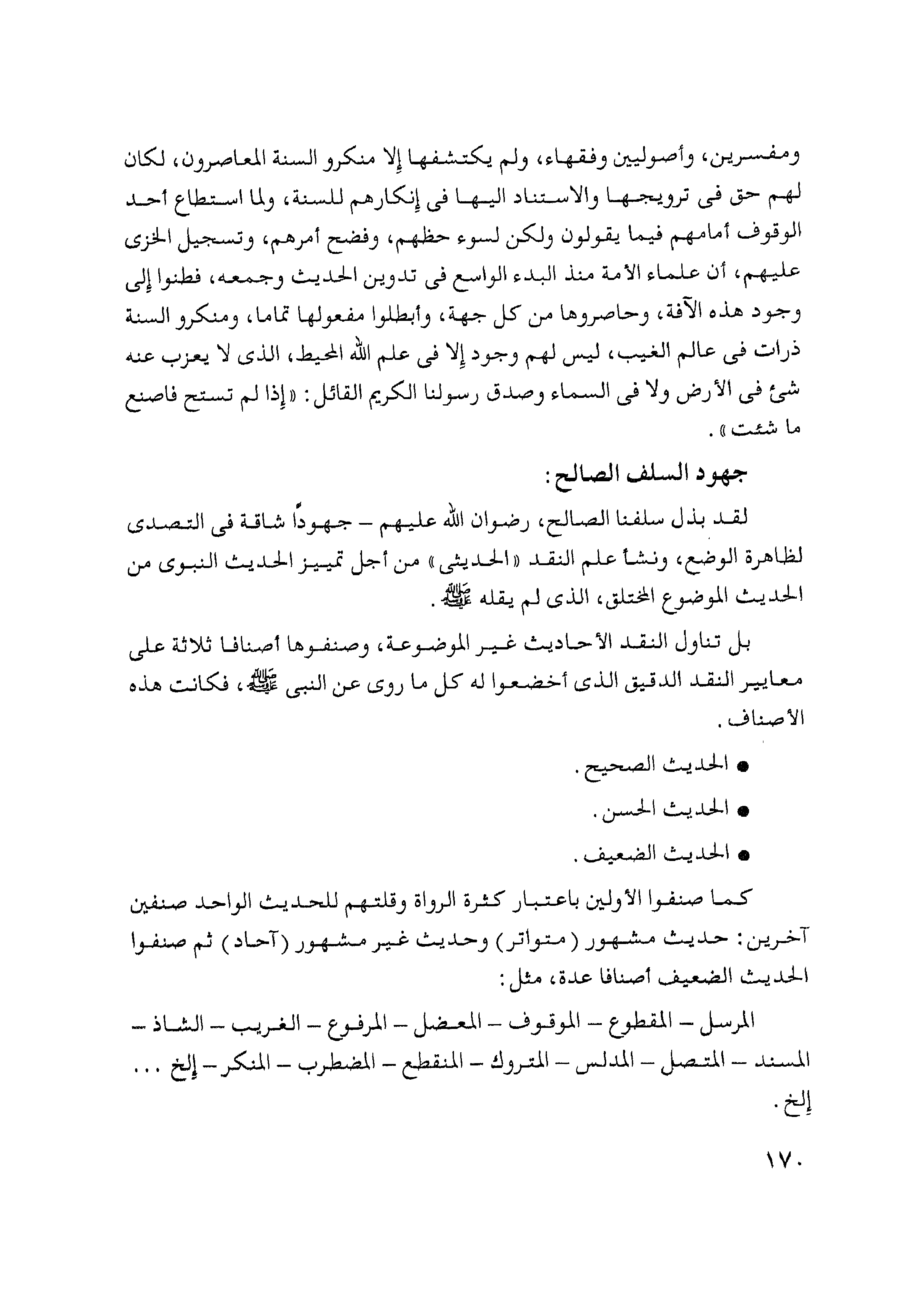 ومفسرين، وأصوليين وفقهاء، ولم يكتشفها إلا منكرو السنة المعاصرون، لكان لهم حق في ترويجها والاستناد إليها في إنكارهم للسنة، ولما استطاع أحد الوقوف أمامهم فيما يقولون ولكن لسوء حظهم، وفضح أمرهم، وتسجيل الخزي عليهم، أن علماء الأمة منذ البدء الواسع في تدوين الحديث وجمعه، فطنوا إلى وجود هذه الآفة، وحاصروها من كل جهة، وأبطلوا مفعولها تماماً، ومنكرو السنة ذرات في عالم الغيب، ليس لهم وجود إلا في علم الله المحيط، الذي لا يعزب عنه شيء في الأرض ولا في السماء وصدق رسولنا الكريم القائل: "إذا لم تستح فاصنع ما شئت".