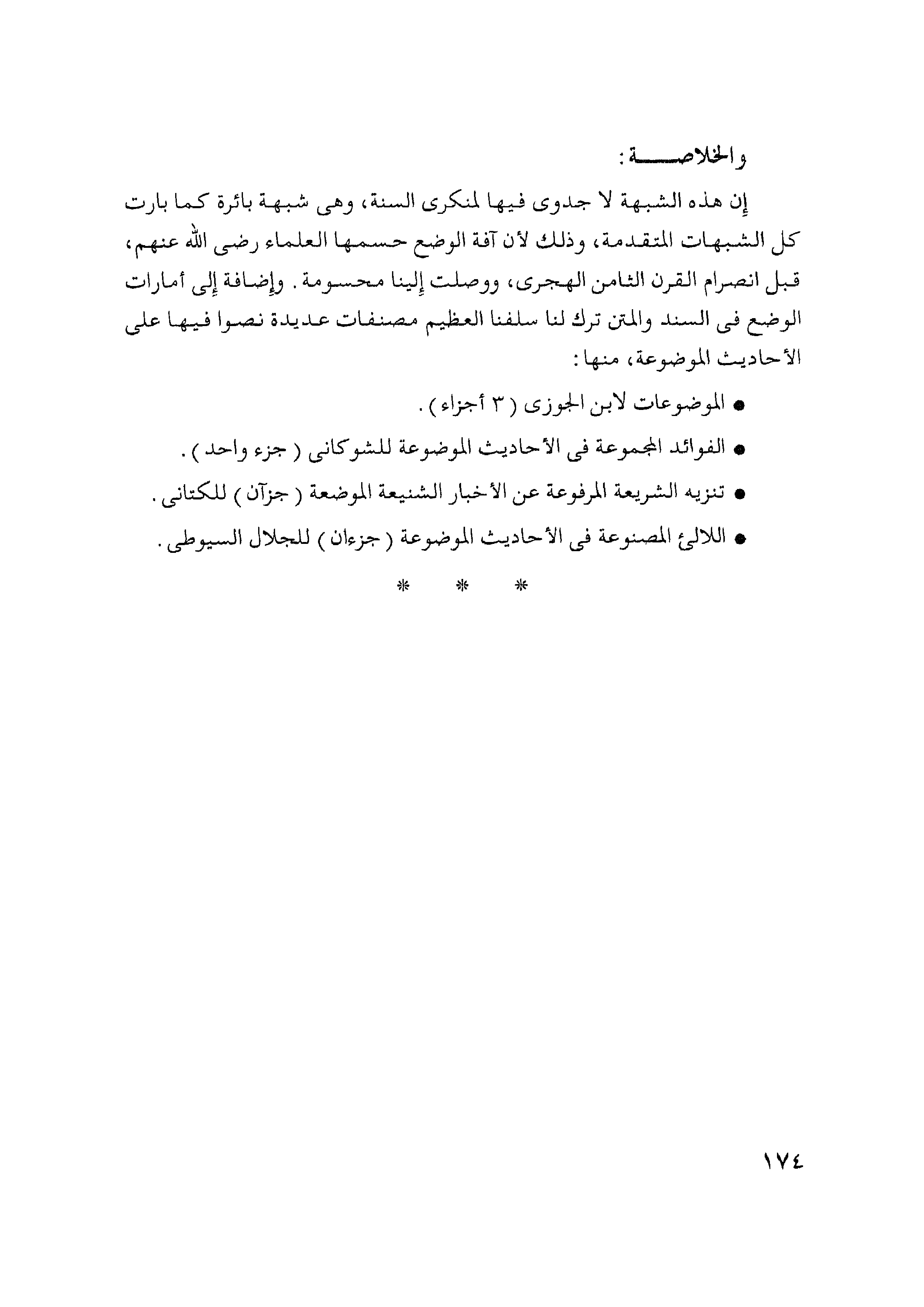 إن هذه الشبهة لا جدوى فيها لمنكري السنة، وهي شبهة بائرة كما بارت كل الشبهات المتقدمة، وذلك لأن آفة الوضع حسمها العلماء - رضي الله عنهم -، قبل انصراف القرن الثامن الهجري، ووصلت إلينا محسومة. وغضافة إلى أمارات الوضع في السند والمتن ترك لنا سلفنا العظيم مصنفات عديدة نصوا فيها على الأحاديث الموضوعة، منها: