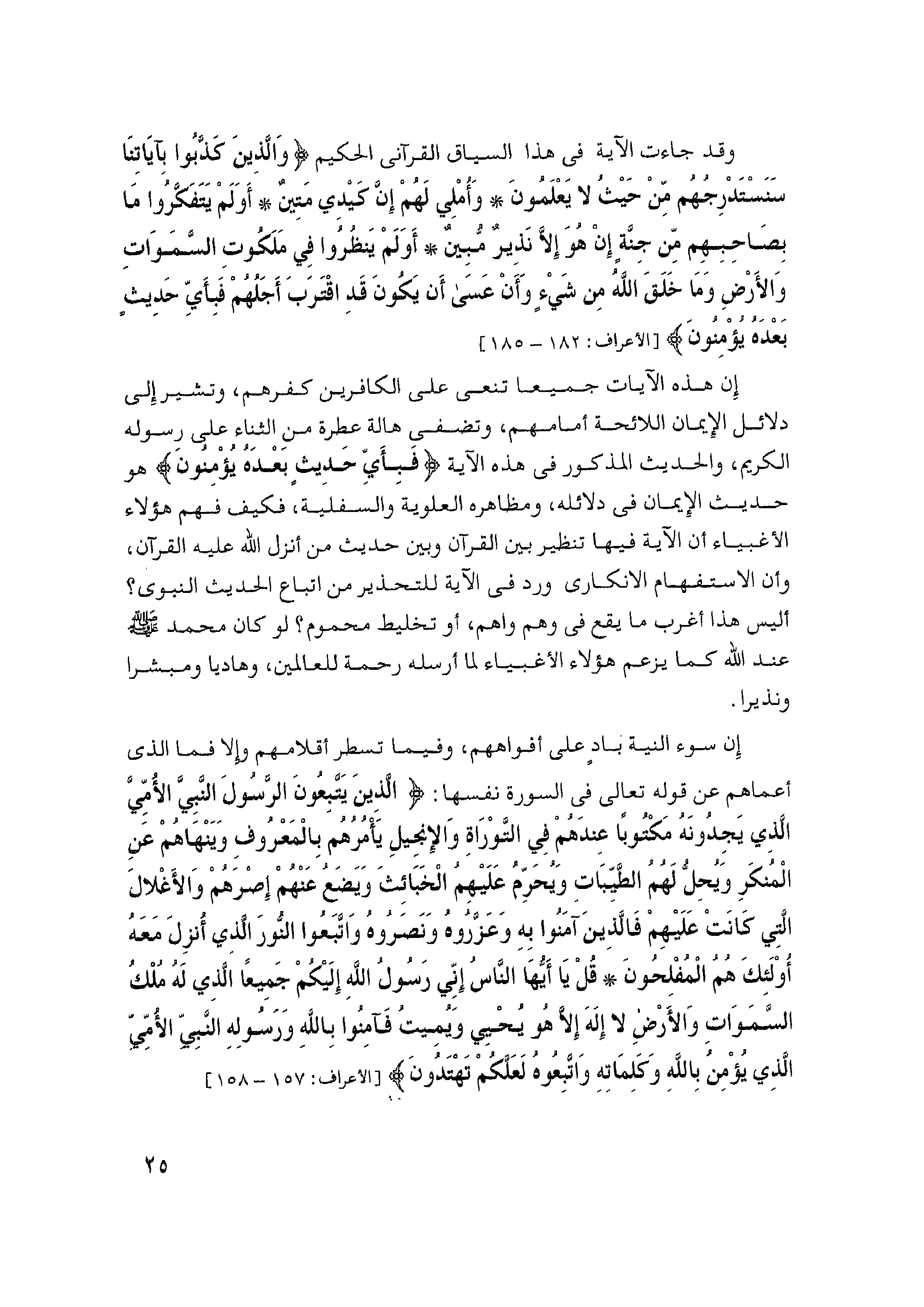 إن هذه الآيات جميعاً تنعى على الكافرين كفرهم، وتشير إلى دلائل الإيمان اللائحة امامهم، وتضفى هالة من الثناء على رسوله الكريم، والحديث المذكور في هذه الآية {فَبِأَيِّ حَدِيثٍ بَعْدَهُ يُؤْمِنُونَ} هو حديث الإيمان في دلائله، ومظاهره العلوية والسفلية، فكيف فهم هؤلاء الأغبياء أن الآية فيها تنظير بين القرآن وبين حديث من أنزل عليه القرآن، وأن الاستفهام الإنكاري ورد في الآية للتحذير من اتباع الحديث النبوي؟ أليس هذا أغرب ما يقع في وهم واهم، أو تخليط محموم؟ لو كان محمد - صلى الله عليه وسلم - عند الله كما يزعم هؤلاء الأغبياء لما أرسله رحمة للعالمين، وهادياً ومبشراً ونذيراً.