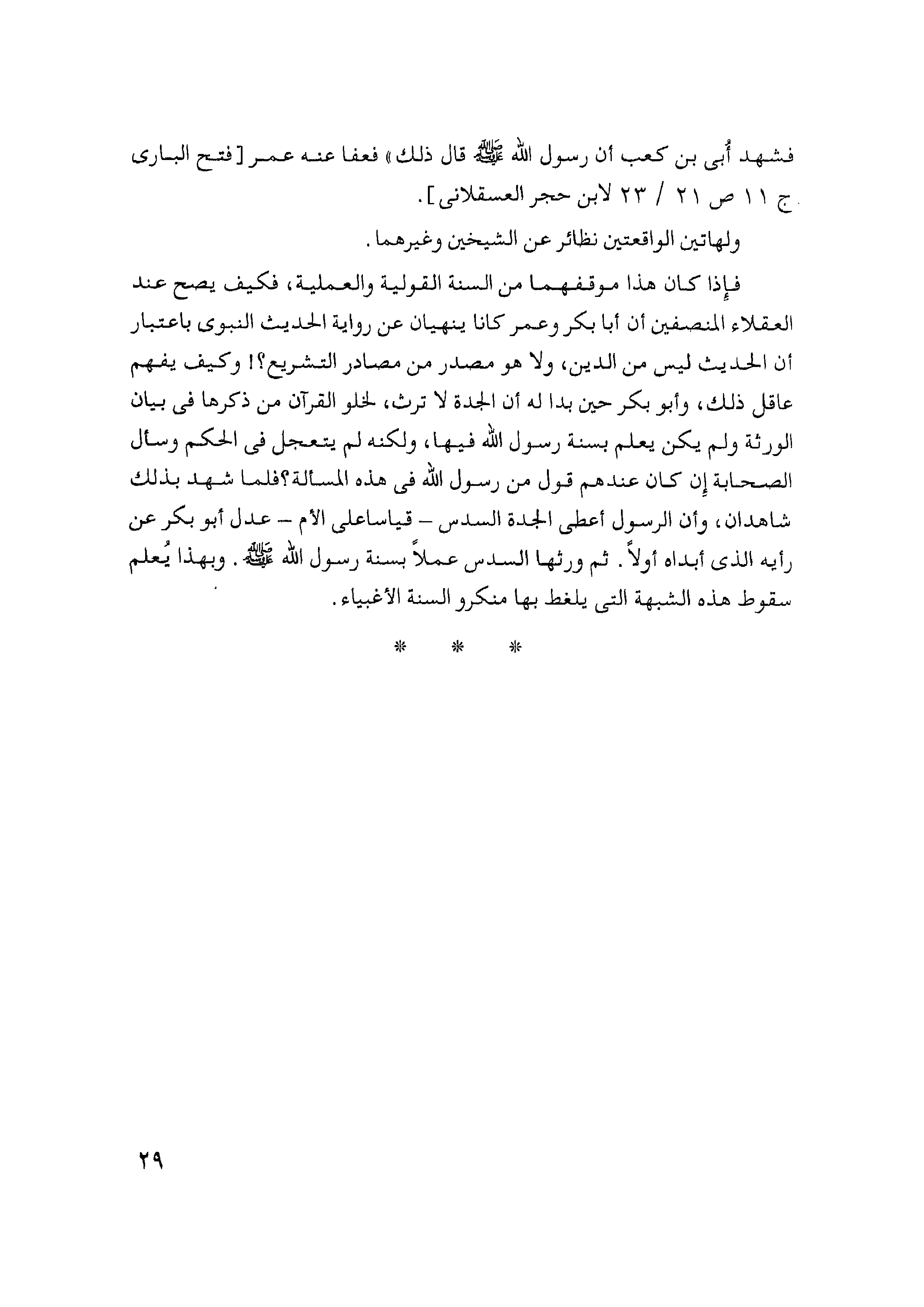 فإذا كان هذا موقفهما من السنة القولية والعملية، فكيف يصح عند العقلاء المنصفين أن ابا بكر وعمر كانا ينهيان عن رواية الحديث النبوي باعتبار أن الحديث ليس من الدين، ولا هو مصدر من مصادر التشريع؟! وكيف يفهم عاقل ذلك، وابو بكر حين بدا له أن الجدة لا ترث، لخلو القرآن من ذكرها في بيان الورثة ولم يكن يعلم بسنة رسول الله فيها، ولكنه لم يتعجل في الحكم وسأل الصحابة إن كان عندهم قول من رسول الله في هذه المسألة؟ فلما شهد بذلك شاهدان، وأن الرسول أعطى الجدة السدس - قياساً على الأم - عدل أبو بكر عن رأية الذي أبداه أولاً. ثم ورثها السدس بسنة رسول الله - رضي الله عنه -. وبهذا يُعلم سقوط هذه الشبهة التي يلغط منها منكرو السنة الأغبياء.
