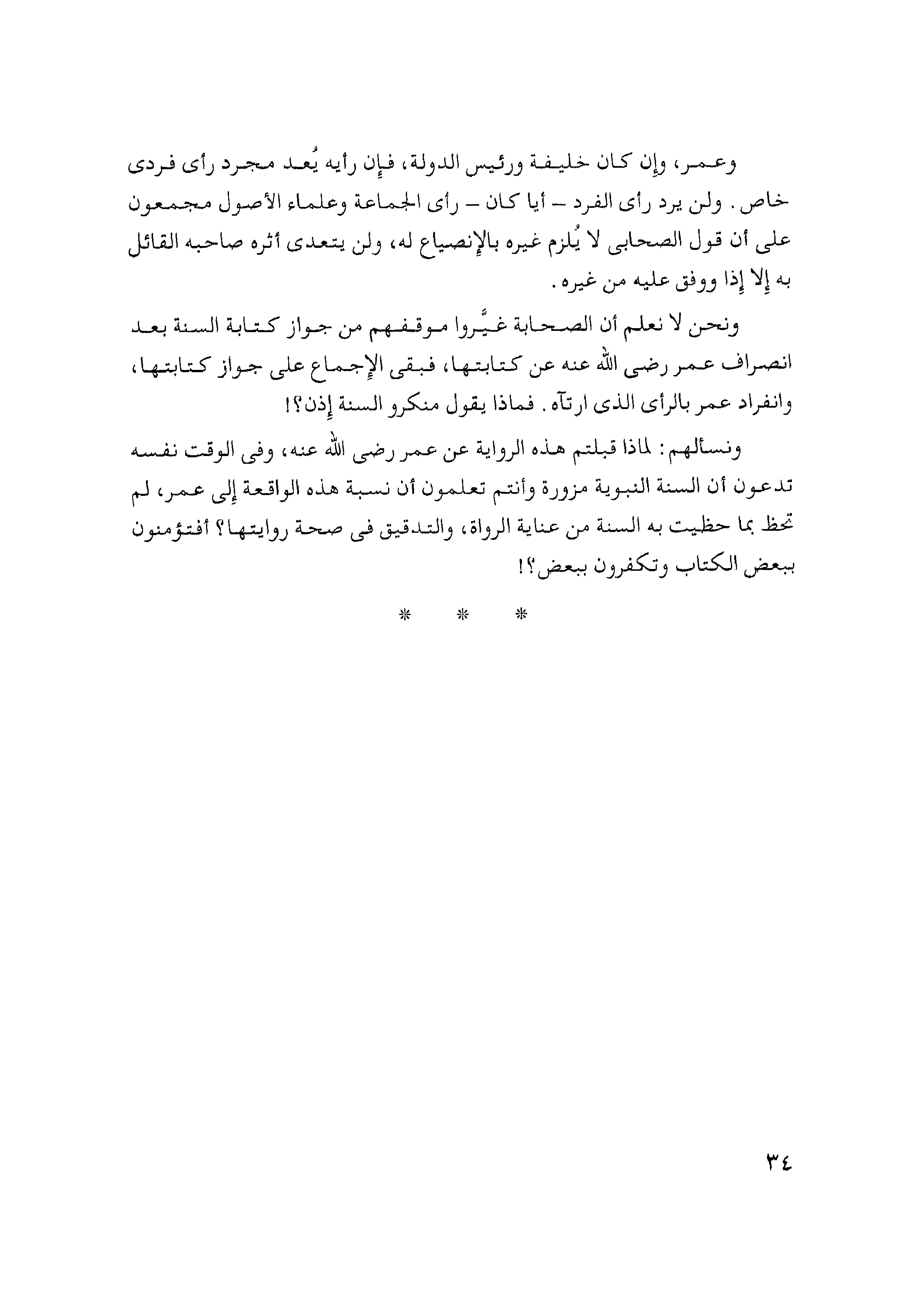 ونحن لا نعلم أن الصحابة غيَّروا موقفهم من جواز كتابة السنة بعد انصراف عمر - رضي الله عنه - عن كتابتها، فبقى الإجماع على جواز كتابتها، وانفراد عمر بارأي الي ارتآه. فماذا يقول منكرو السنة إذن؟!
