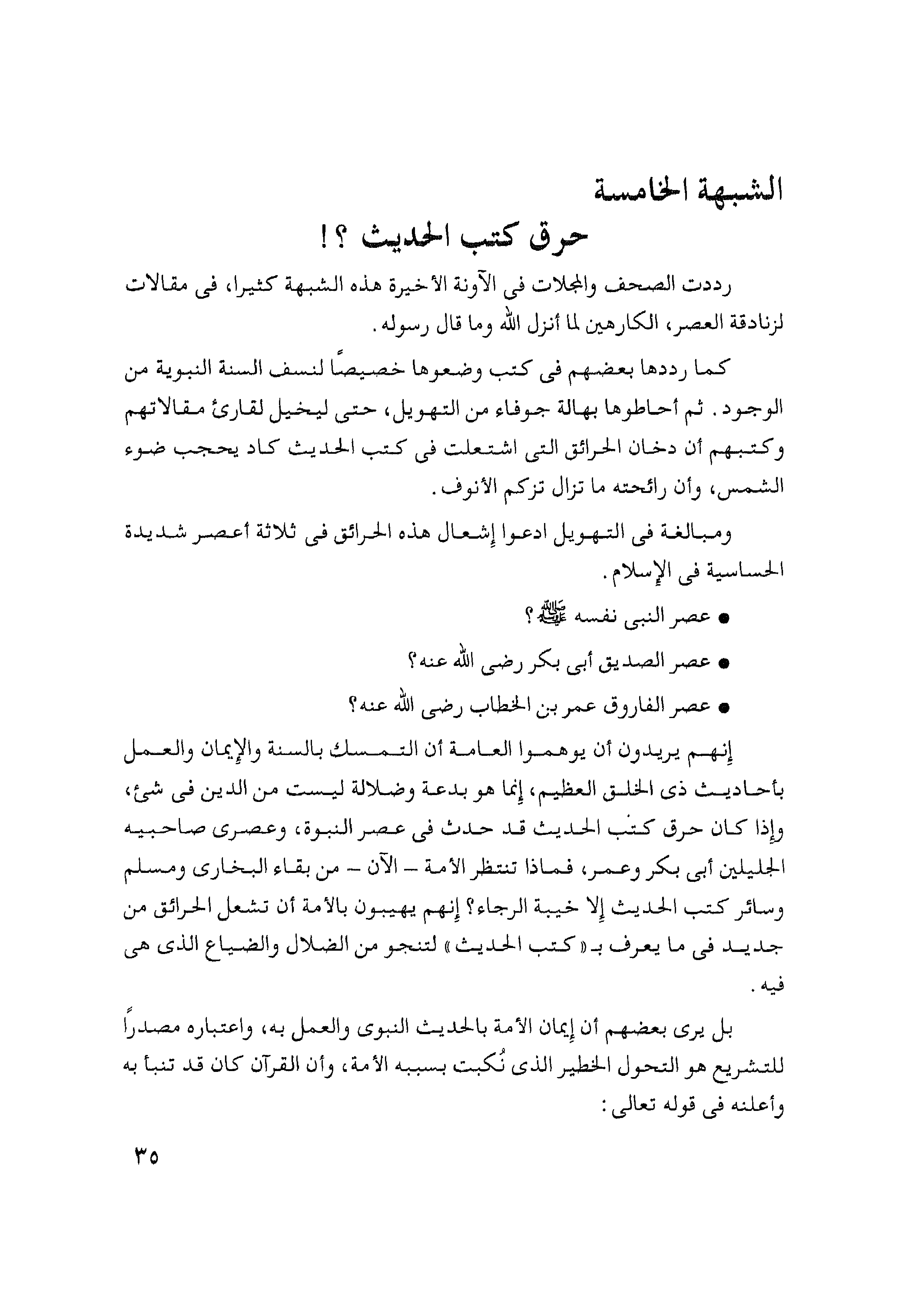 كما رددها بعضهم في كتب وضعوها خصيصاً لنسف السنة النبوية من الوجود. ثم أحاطوها بهالة جوفاء من التهويل، حتى ليخيل لقارئ مقالاتهم وكتبهم أن دخان الحرائق التي اشتعلت في كتب الحديث كاد يحجب ضوء الشمس، وأن رائحته ما تزال تزكم الأنوف.
