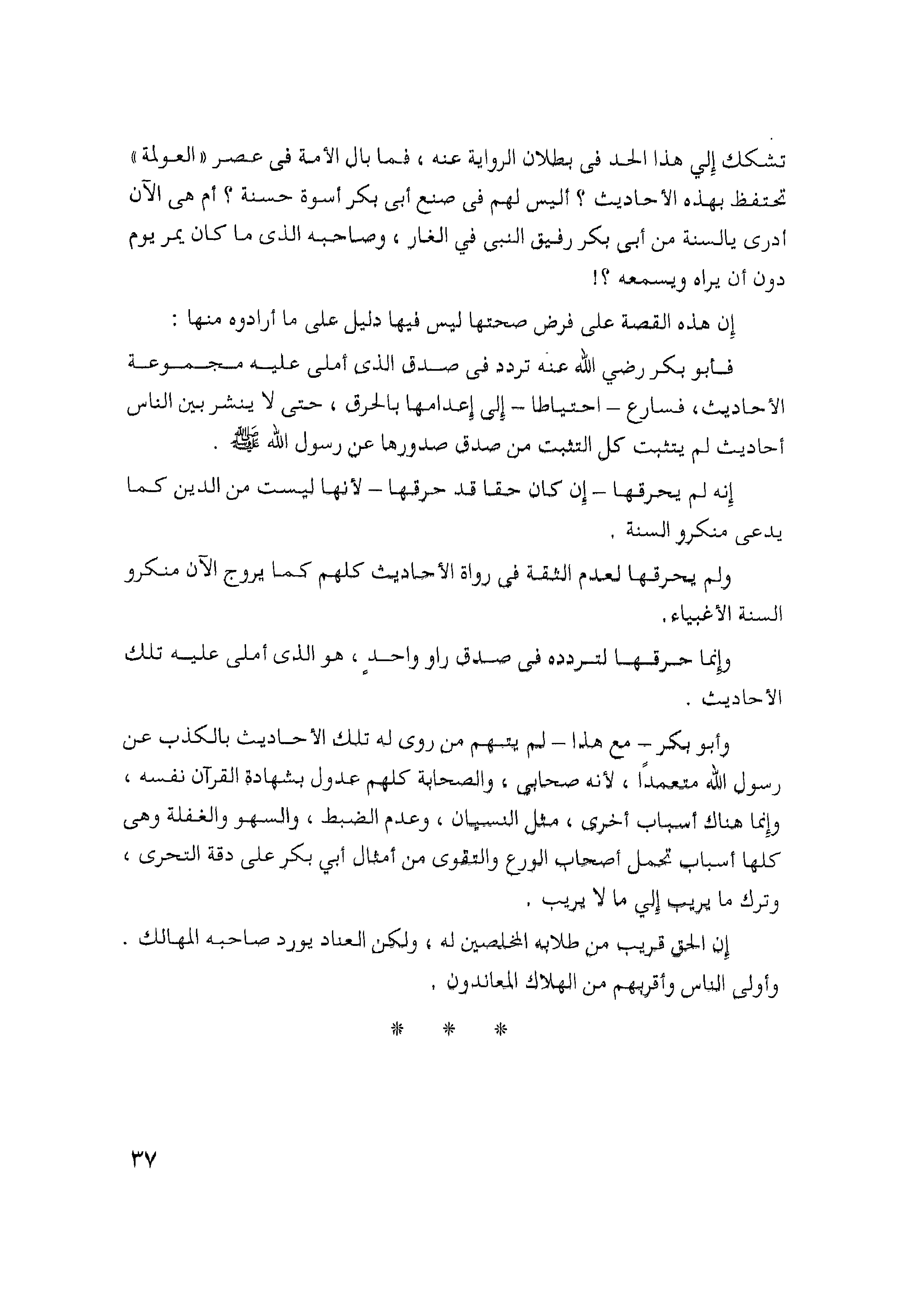 تشكك إلى هذا الحد في بطلان الرواية عنه، فما بال الأمة في عصر "العولمة" تحتفظ بهذه الأحاديث؟ أليس لهم في صنع أبي بكر أسوة حسنة؟ أم هي الآن أدرى بالسنة من أبي بكر رفيق النبي في الغار، وصاحبه الذي ما كان يمر يوم دون أن يراه ويسمعه؟!