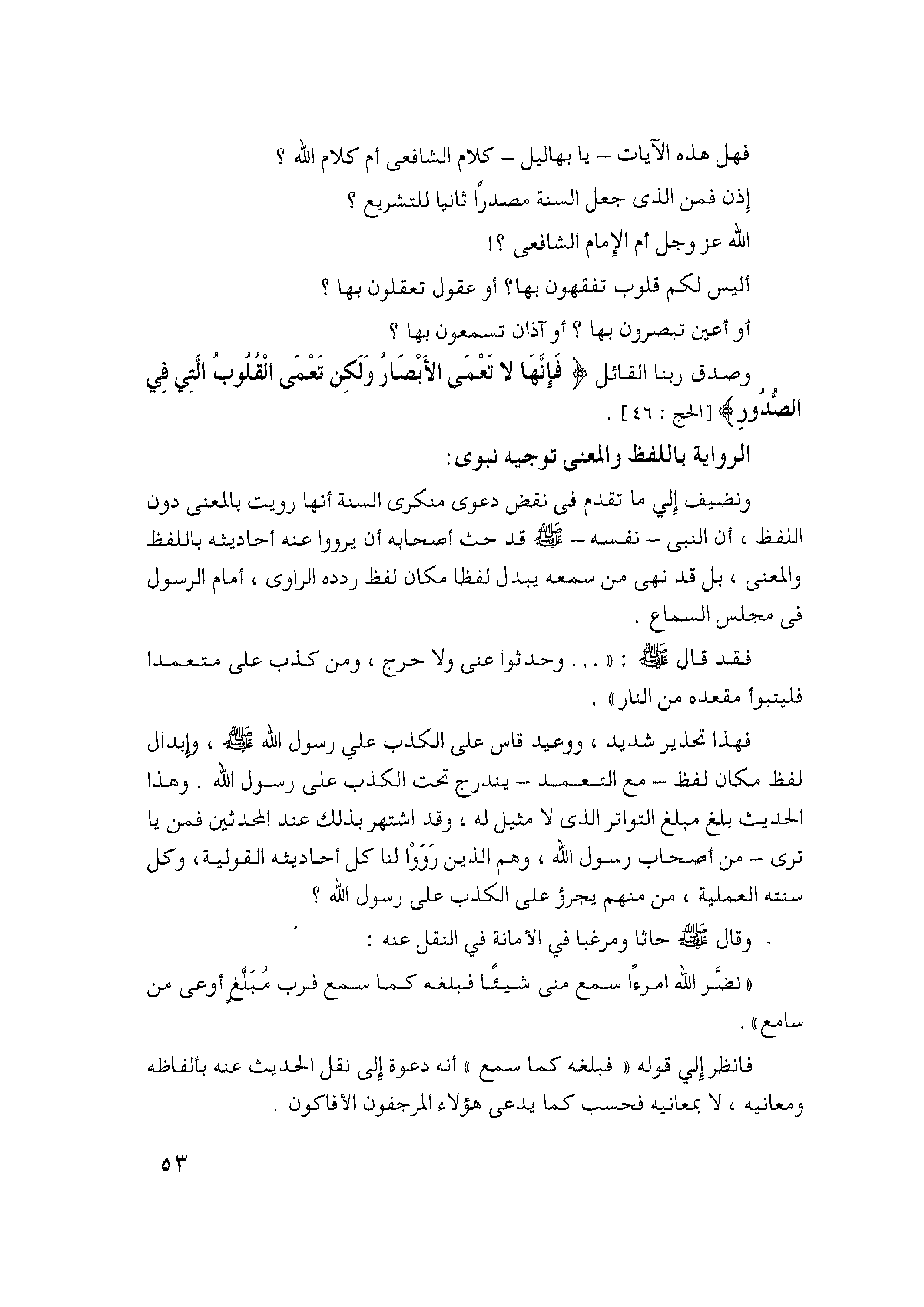 فأنظر إلى قوله "فبلغه كما سمع" أنه دعوة إلى نقل الحديث عنه بألفاظه ومعانيه، لا بمعانيه فحسب كما يدعي هؤلاء المرجفون الأفاكون.