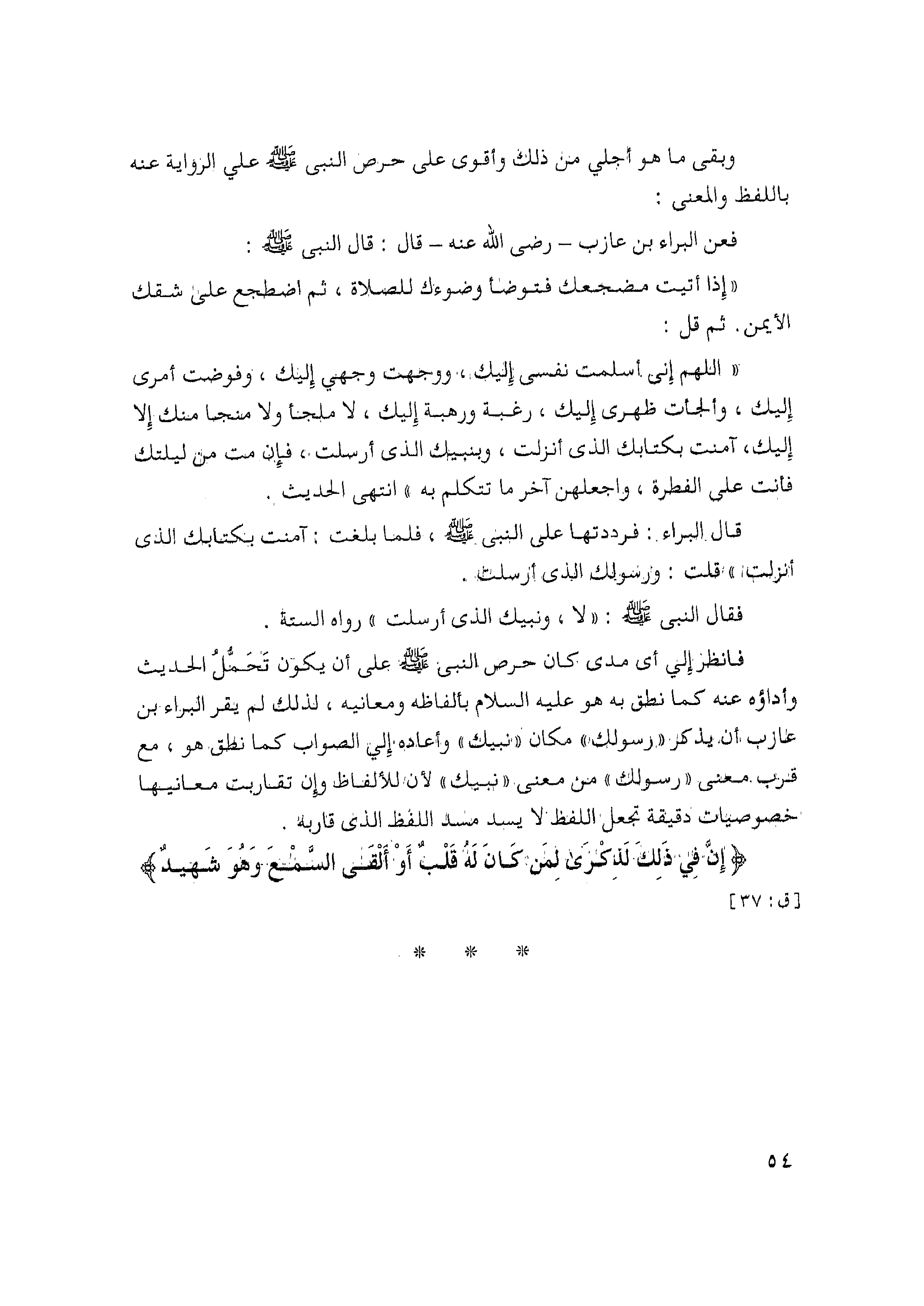 قال البراء: فرددتها على النبي - صلى الله عليه وسلم -، فلما بلغت: آمنت بكتابك الذي أنزلت" قلت: ورسولك الذي أرسلت.