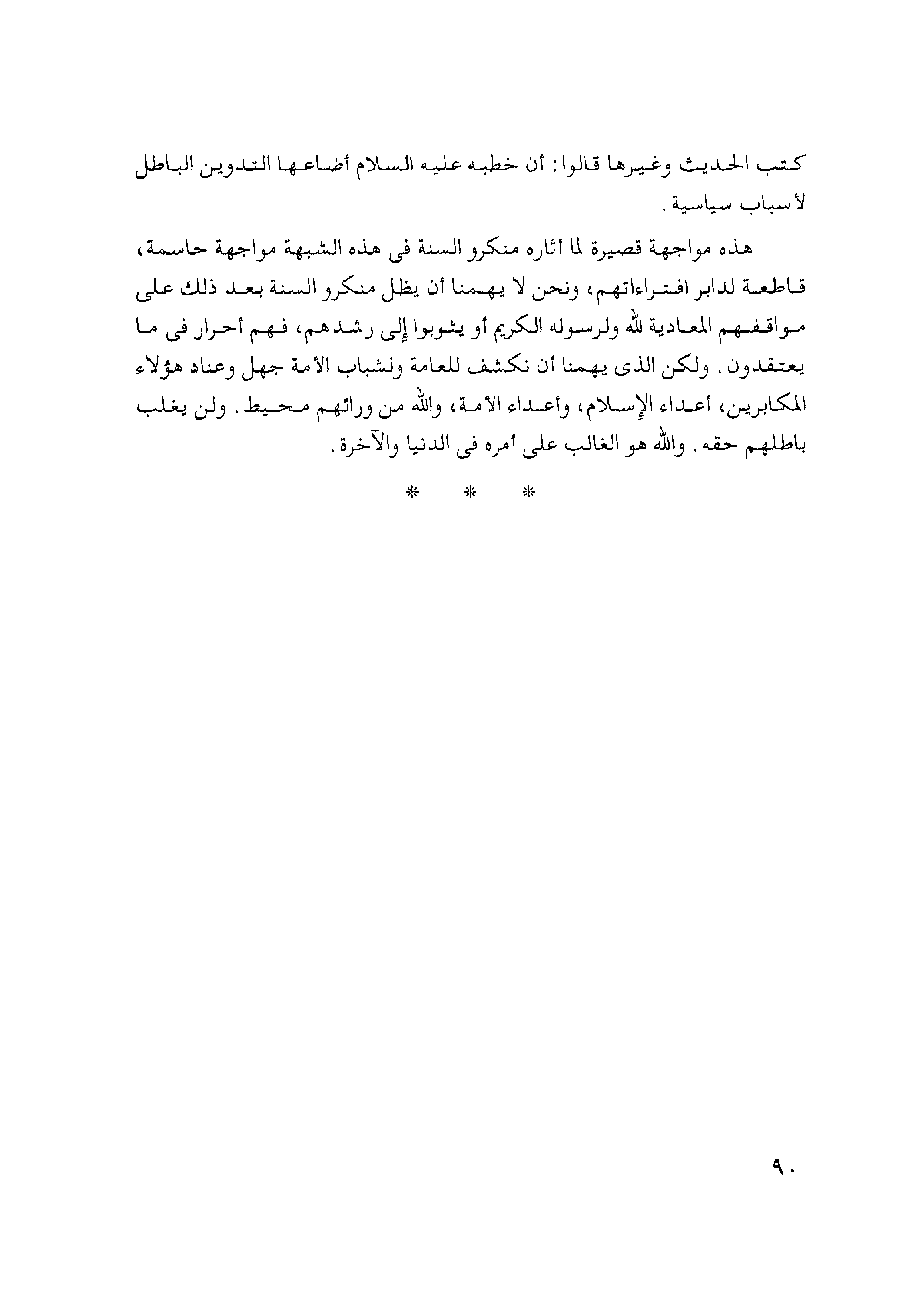 هذه مواجهة قصيرة لما اثاره منكرو السنة في هذه الشبهة مواجهة حاسمة، قاطعة لدابر افتراءاتهم، ونحن لا يهمنا أن يظل منكرو السنة بعد ذلك على مواقفهم المعادية لله ولرسوله الكريم أو يشوبوا إلى رشدهم، فهم أحرار في ما يعتقدون. ولكن الذي يهمنا أن نكشف للعامة ولشباب الأمة جهل وعناد هؤلاء المكابرين، أعداء الإسلام، وأعداء الأمة، والله من ورائهم محيط، ولن يغلب باطلهم حقه. والله هو الغالب على أمره في الدنيا والآخرة.